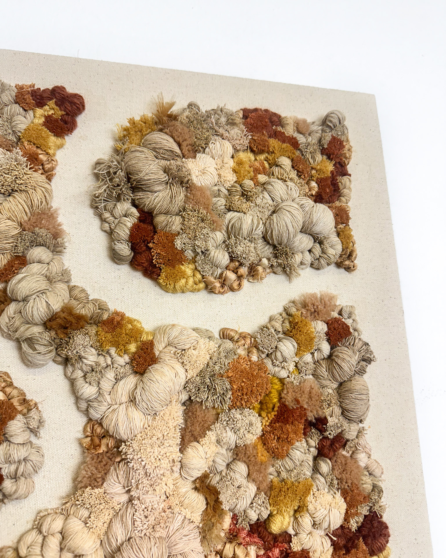 Mariana Baertl's Jungle collection is a textile journey into the vastness of the jungle, inspired by the strength and beauty of nature in its purest state. The collection celebrates the fusion of organic shapes, the richness of textures and the harmony of earthy tones and greens that intertwine in the vegetation. Each piece is created on a cotton canvas and embroidered with hand-dyed cotton thread, wool and silk ribbon, materials that add depth and unique nuances. The result is a series of rich, enveloping compositions that evoke the diversity, movement and energy of the jungle, inviting you to bring a piece of living nature into any space.