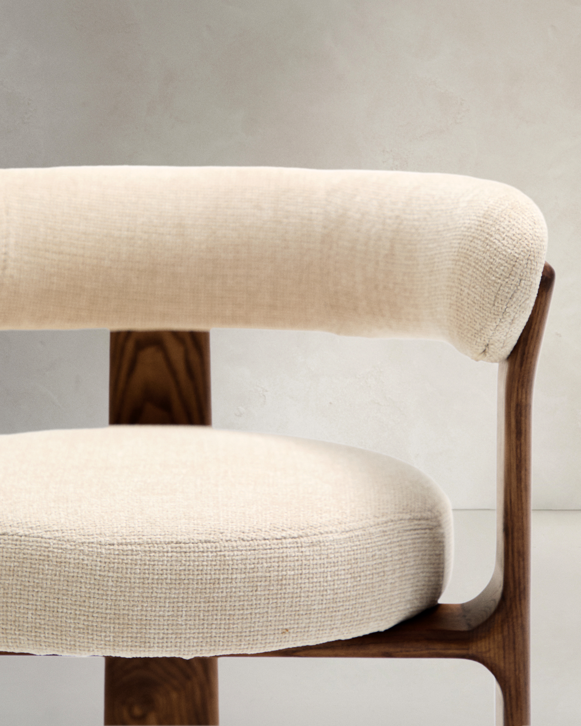 • Chair upholstered in thick, two-tone beige chenille with recycled polyester.