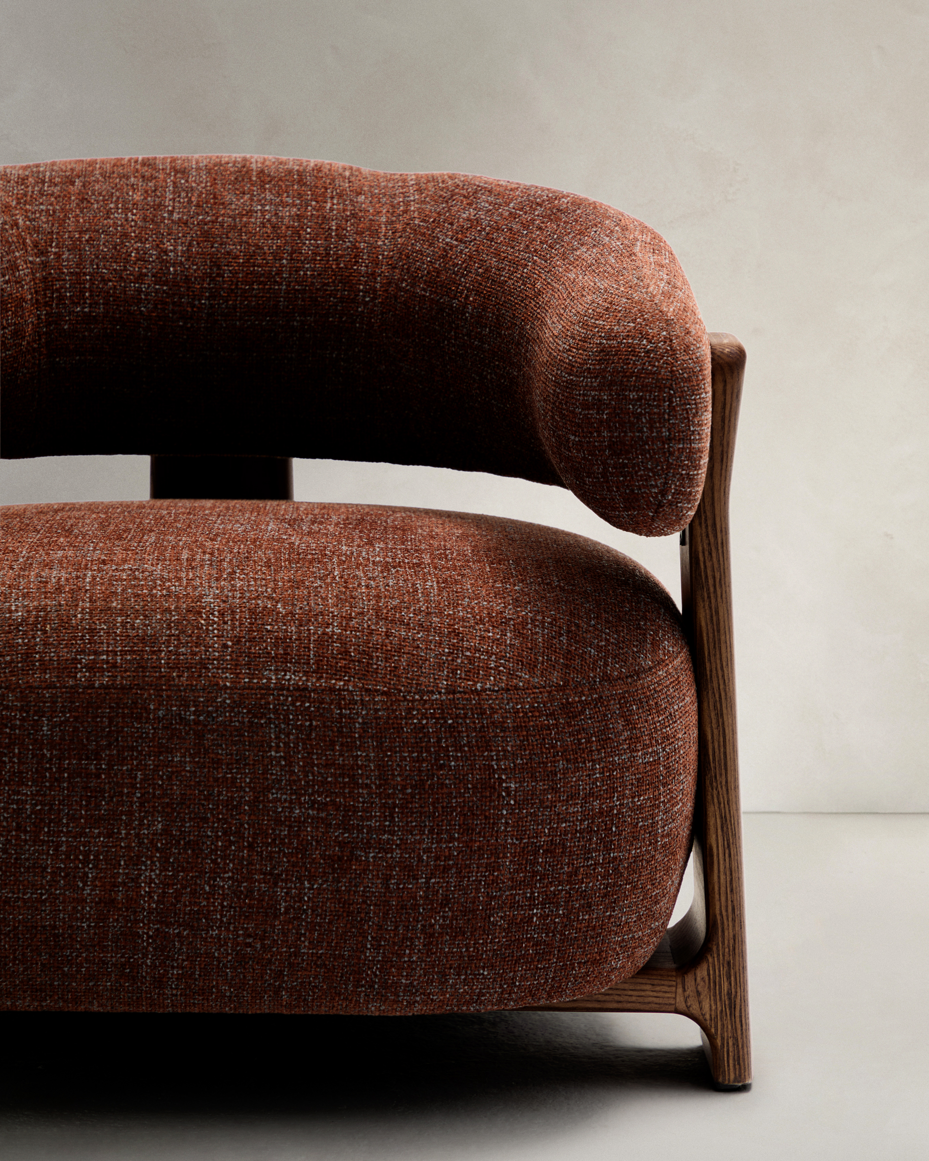• Armchair upholstered in thick, two-tone brown chenille with recycled polyester and solid ash wood legs in a walnut finish.