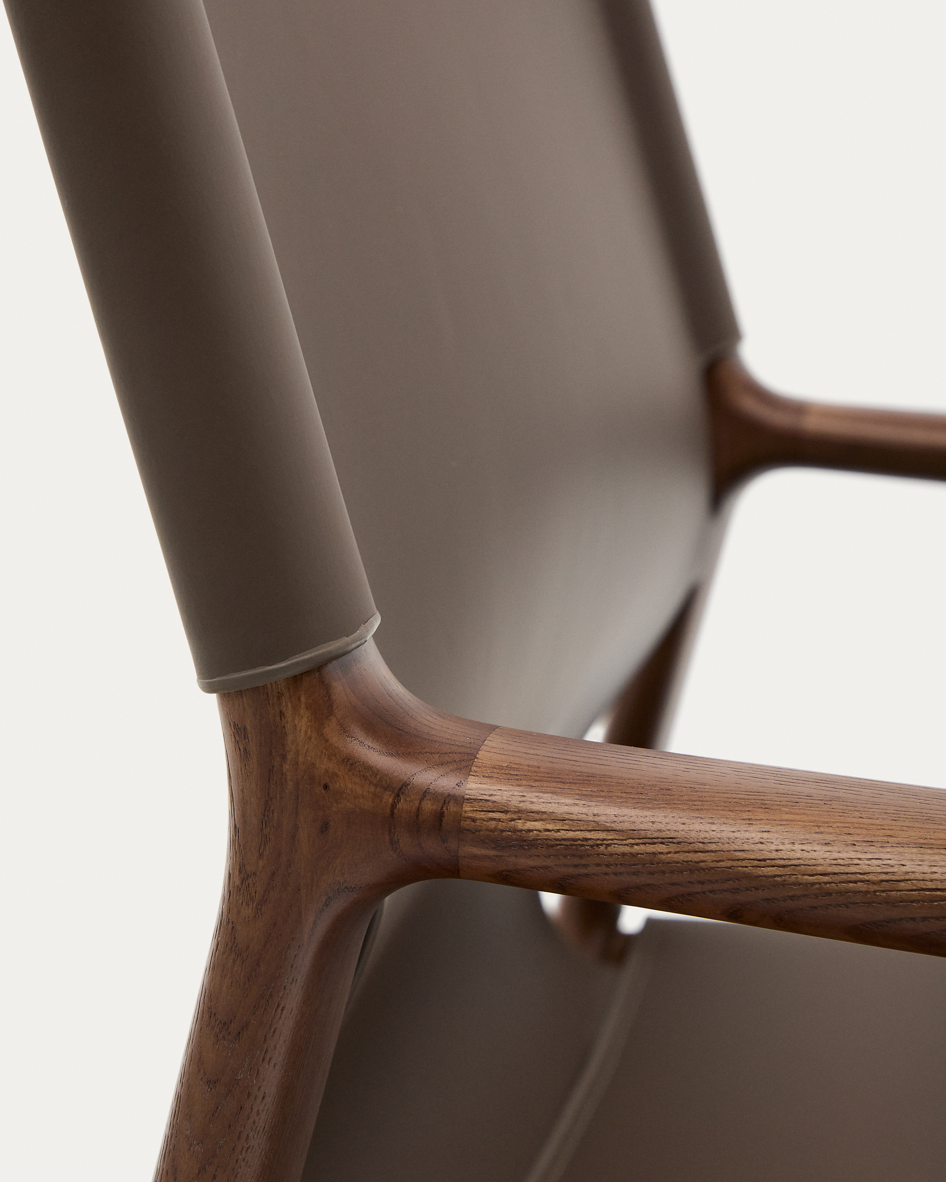 Jan armchair made of dark brown recycled leather fibres and FSC 100% solid ash wood with walnut-coloured finish