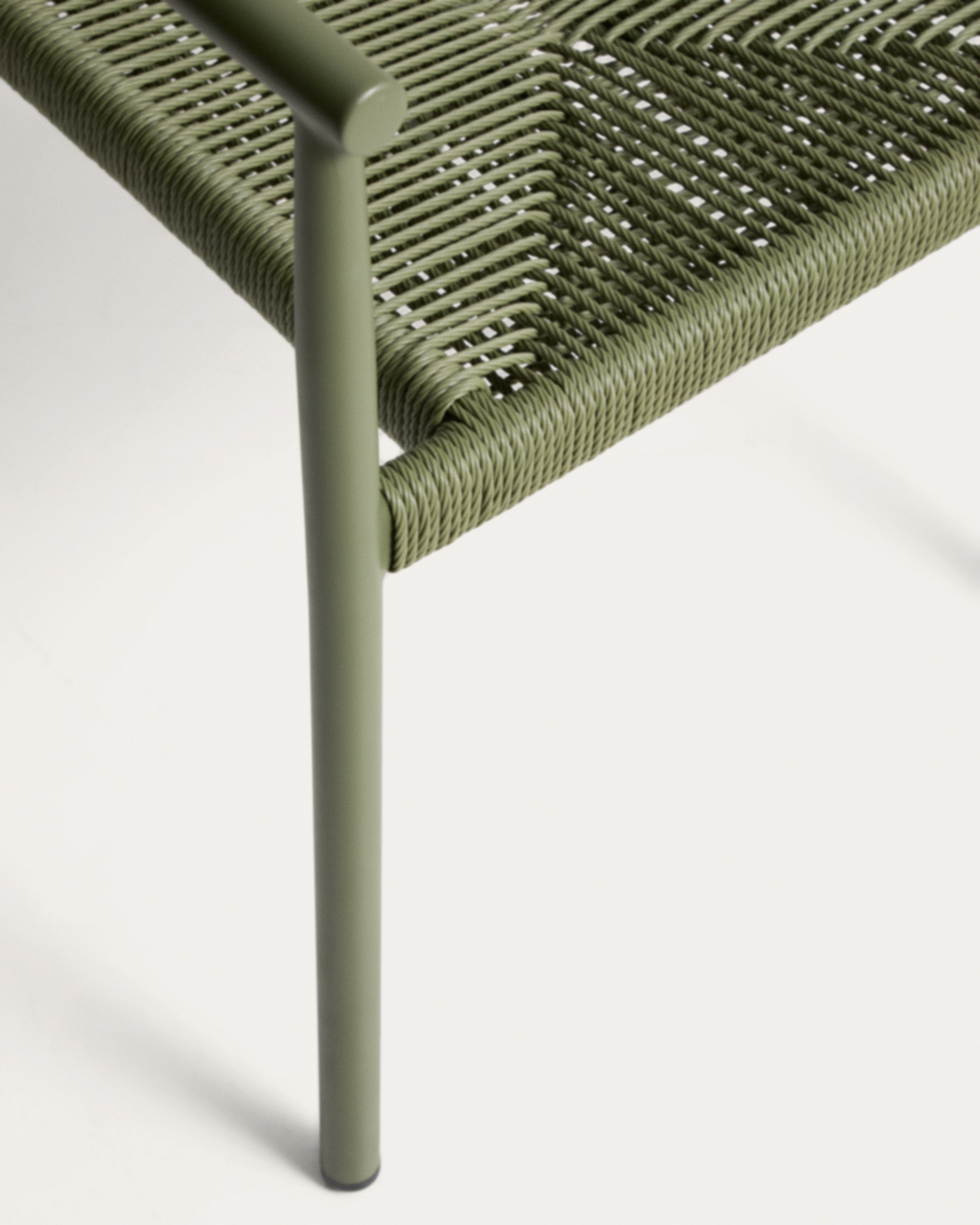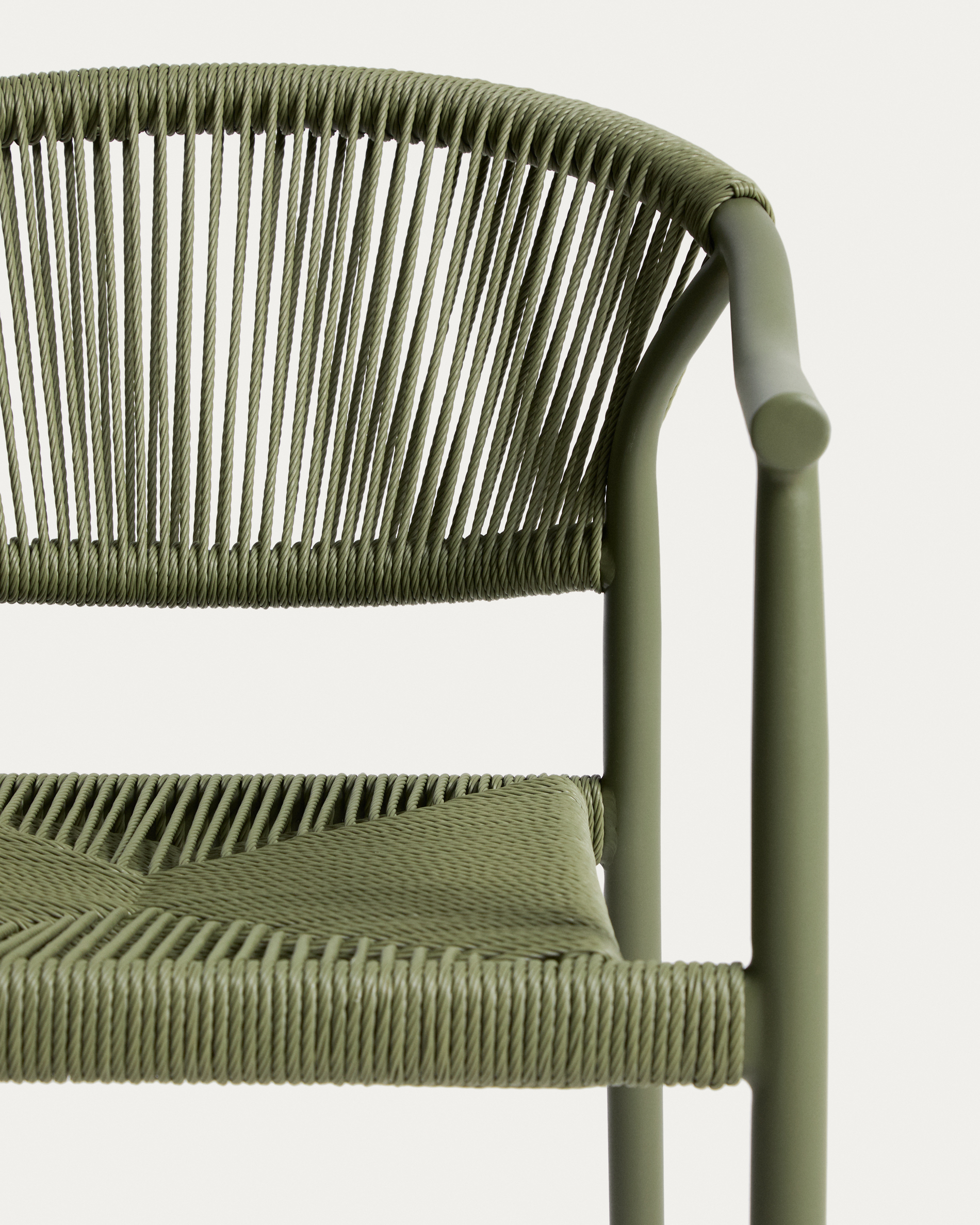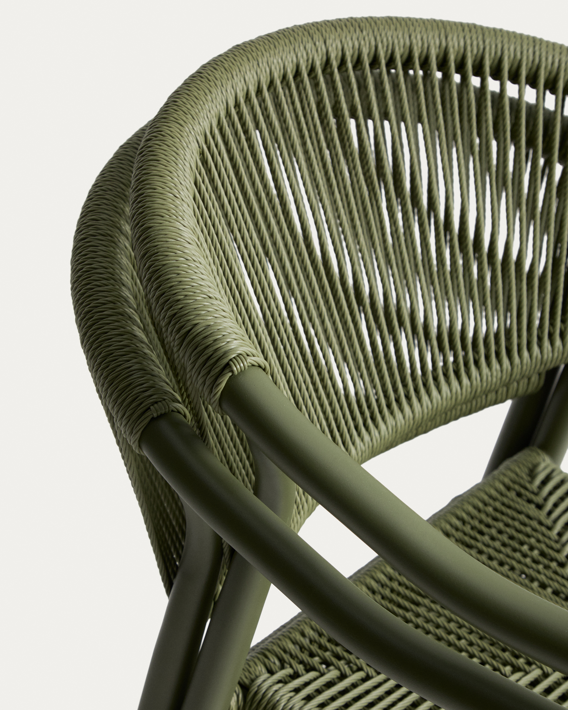 • Hand-woven Hand-woven synthetic rope cord backrest and seat suitable for outdoor use.