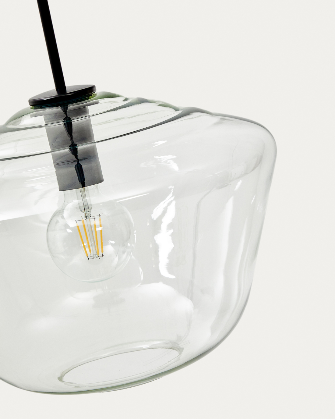 • Ceiling lamp made of glass with a clear finish and black mount.