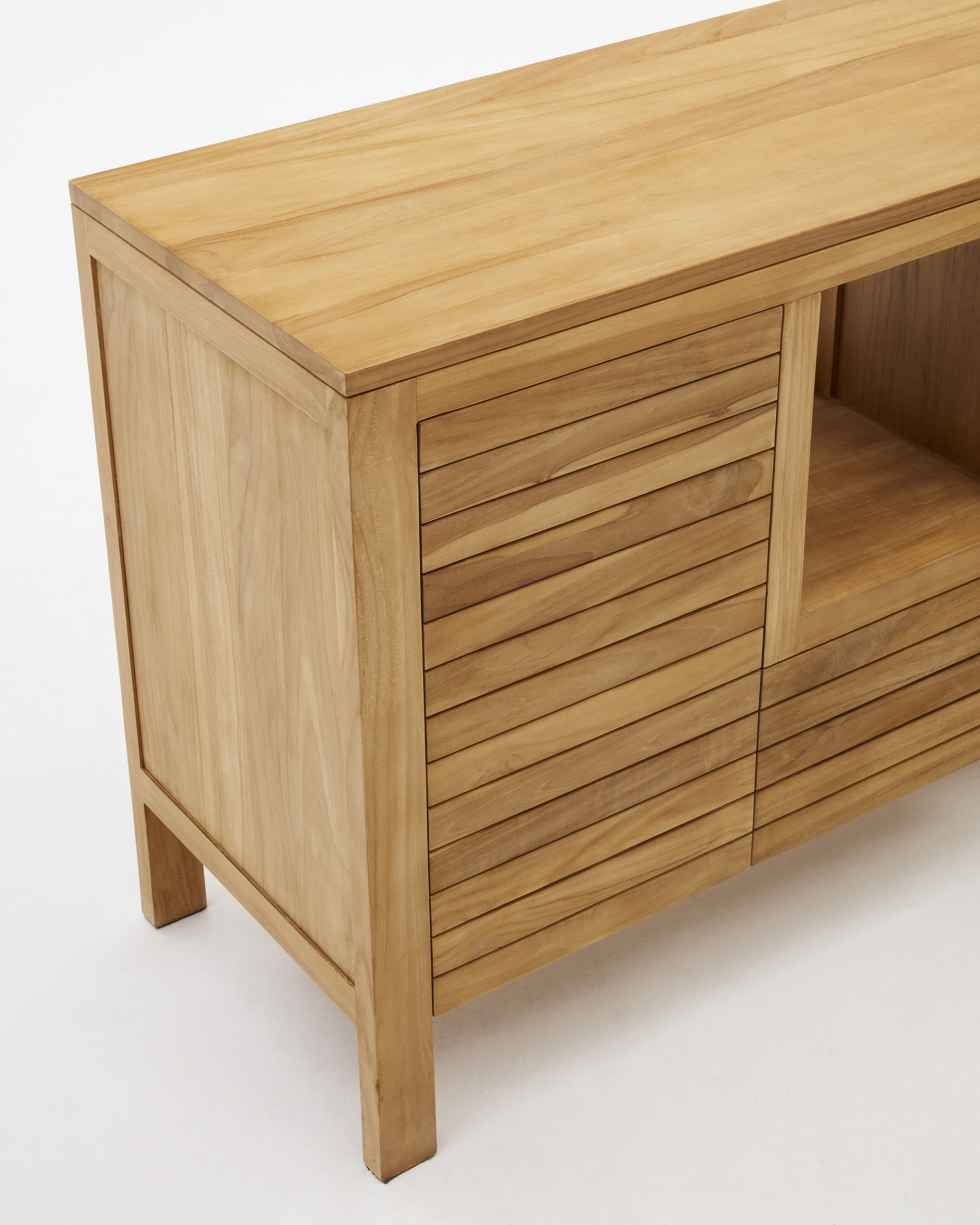 • Solid teak bathroom furniture with a natural finish, two doors, and a central drawer.