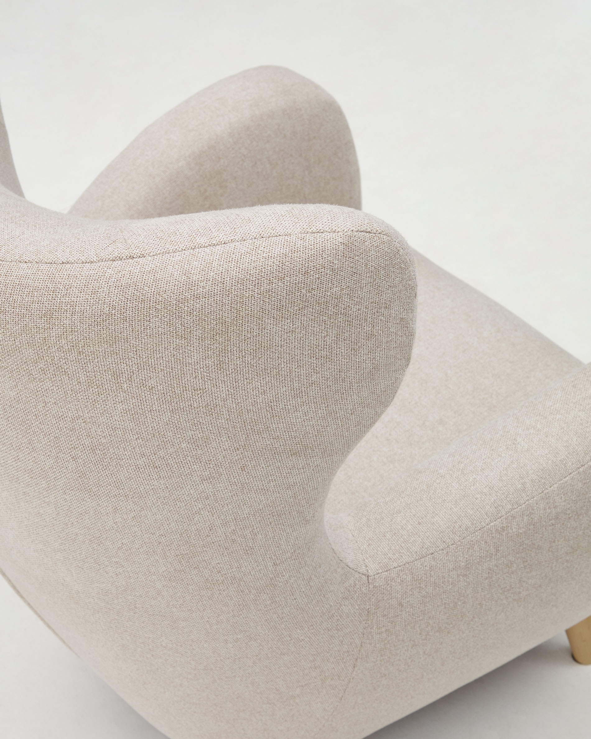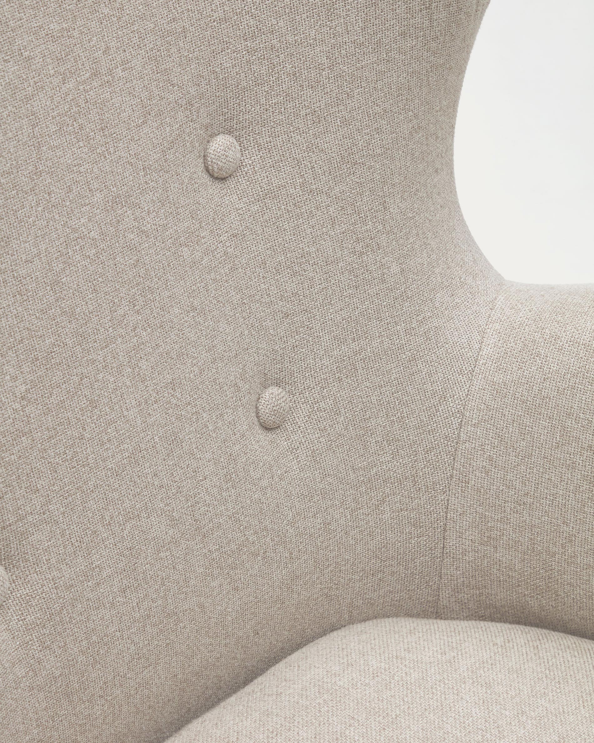 • Armchair upholstered in a beige, textured fabric. Legs of solid natural beech wood.