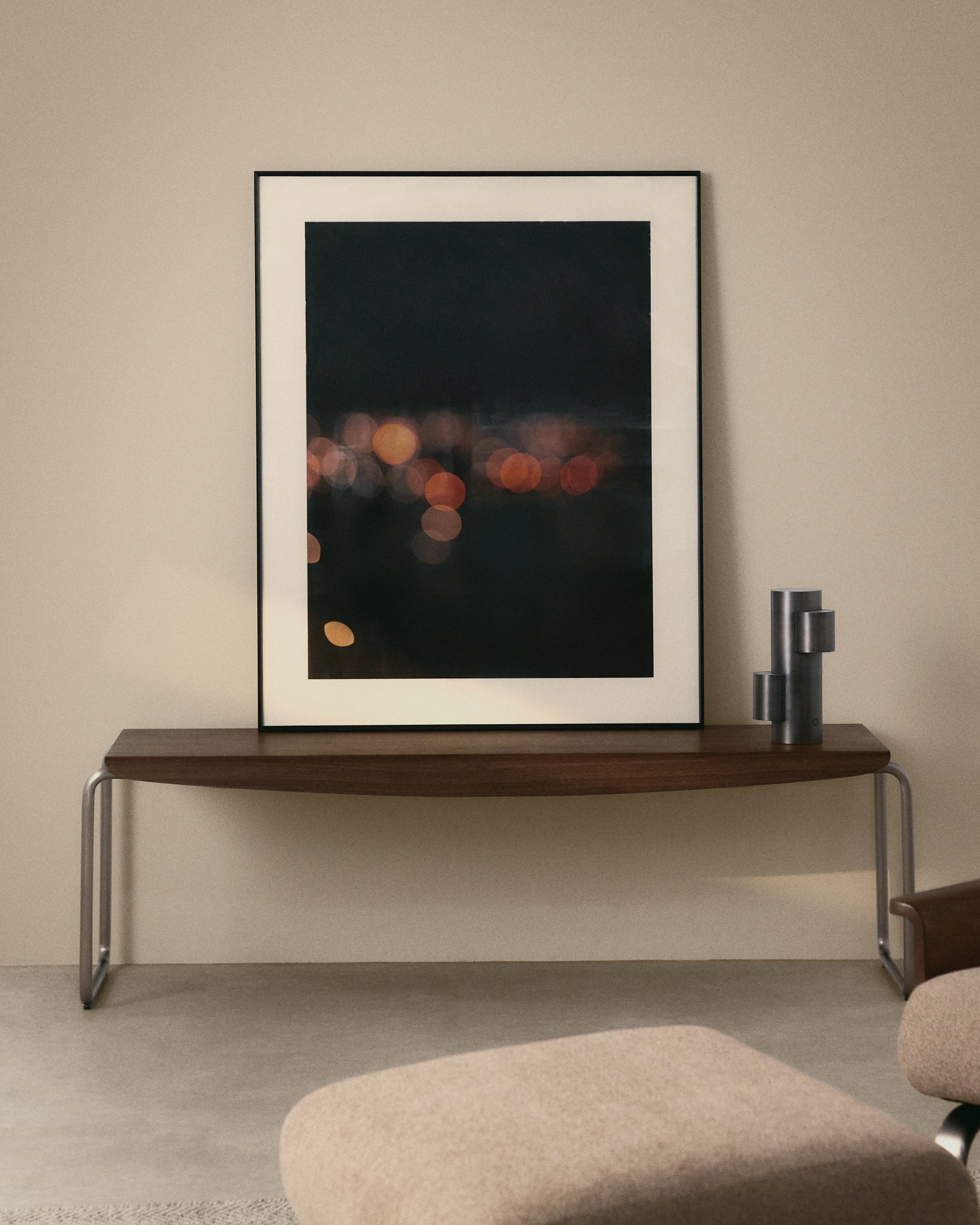• Bench in 0.6mm walnut veneer with dark finish and tubular stainless steel structure with brushed effect, which reduces the visibility of fingerprints.