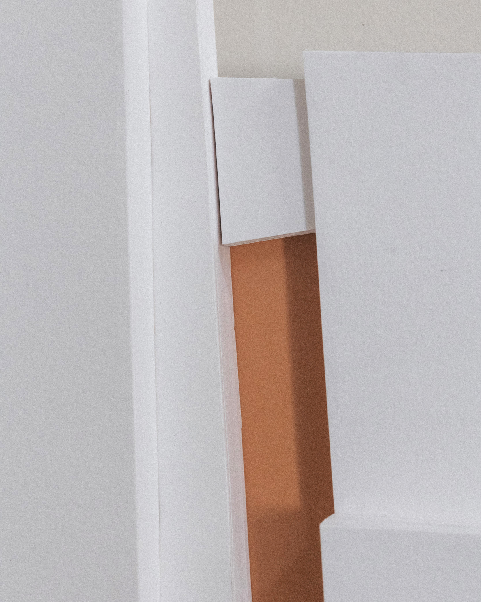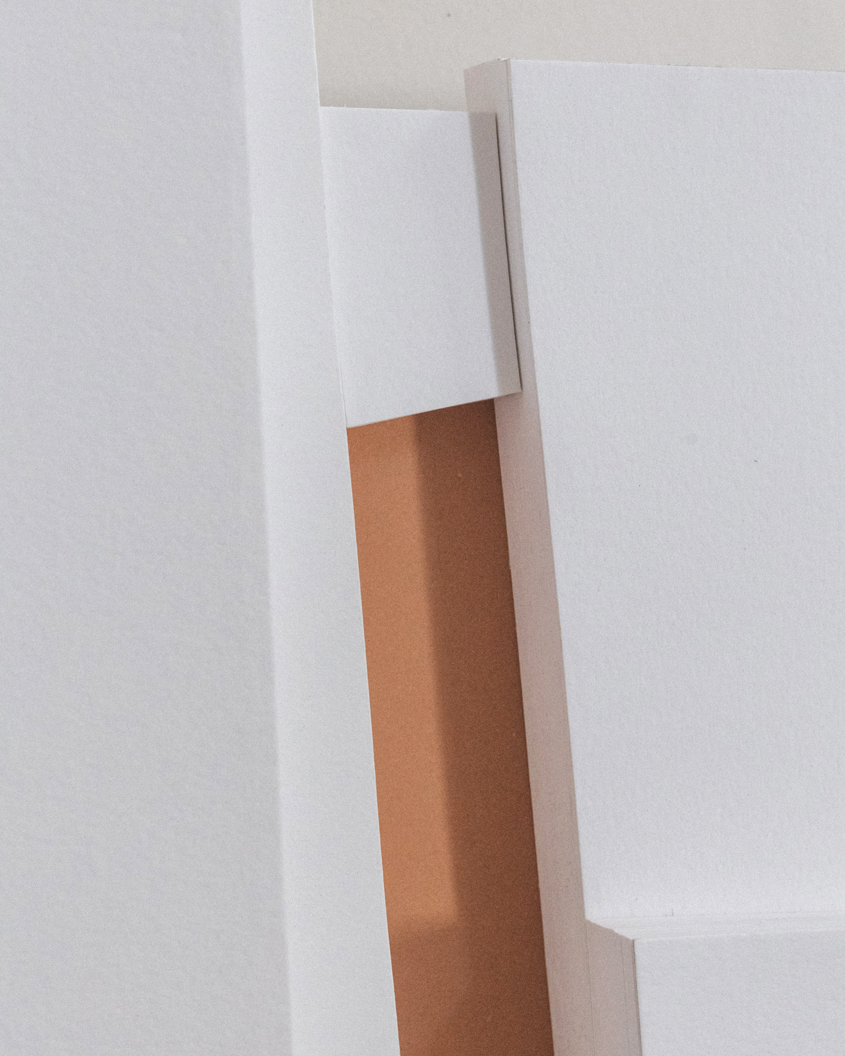 Tectonías explores how architecture shapes the spaces in which we live, playing with contrasts: the solid and the lightweight, the fragile and the forceful. Through layers of paper, the work combines structure and lightness, creating a dialogue between the fragmented and the continuous. Inspired by the evolution of human dwellings, it draws influences from tectonic architecture, the sculpture of Henry Moore, the Basque school, Japanese semiotics and geology. Its aim is to connect natural shapes with those created by man.