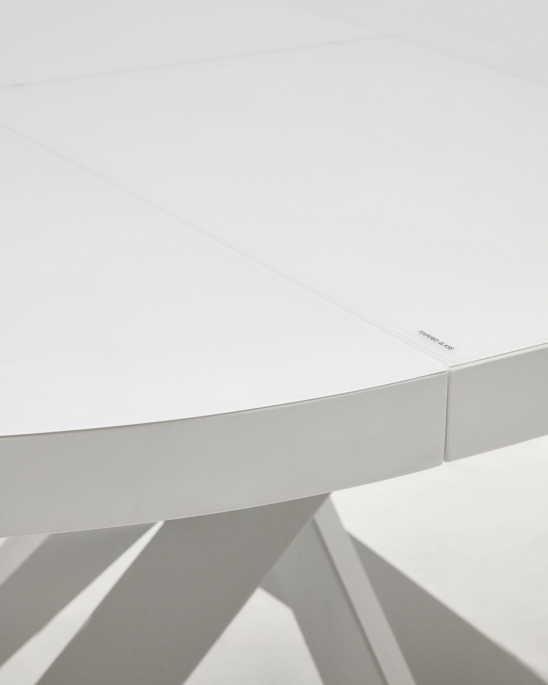 Vashti extendable round table in glass and MDF with steel legs in white, Ø 120(160)x120cm