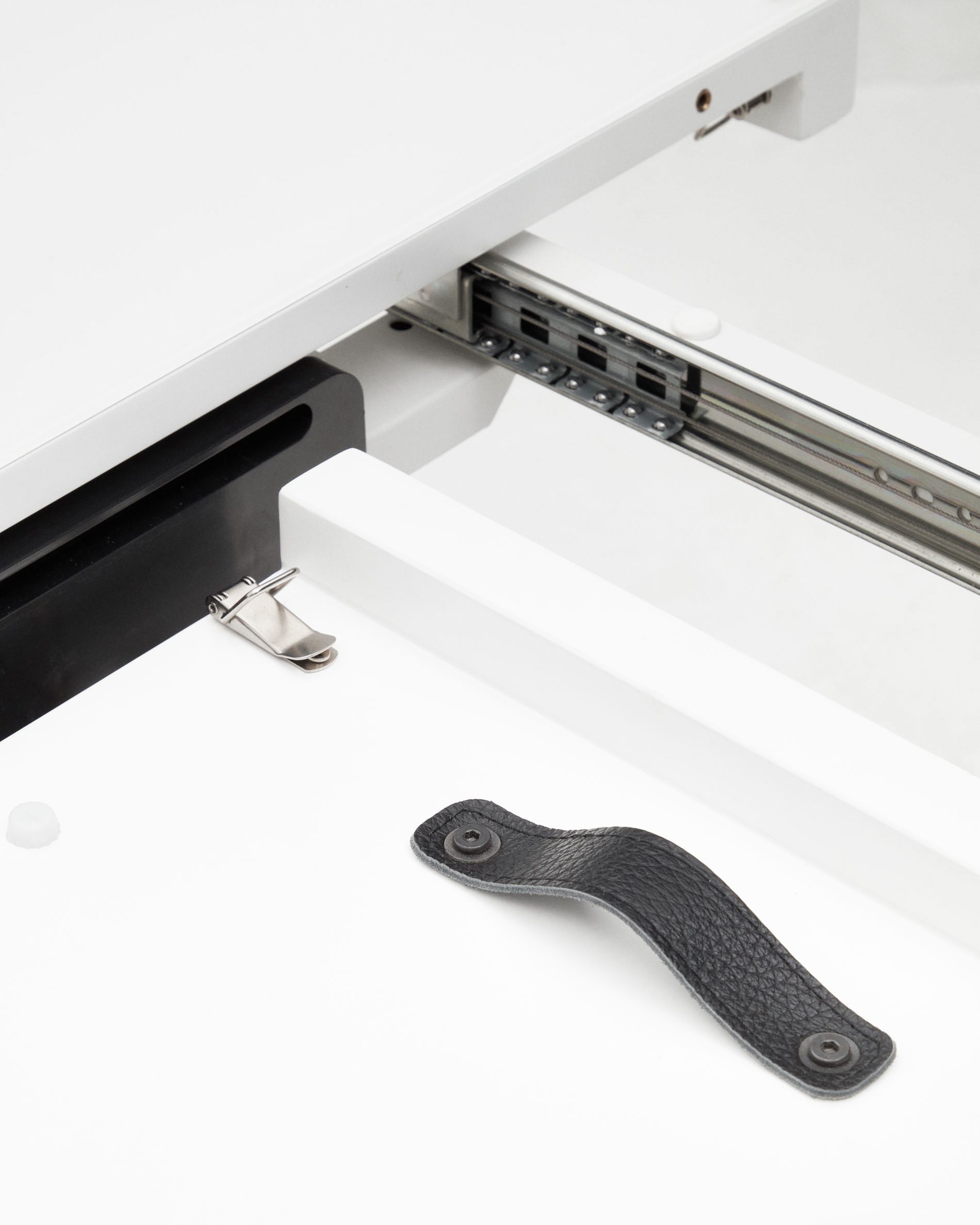 • Tempered glass table top, with better resistance than ordinary glass, in a white finish.