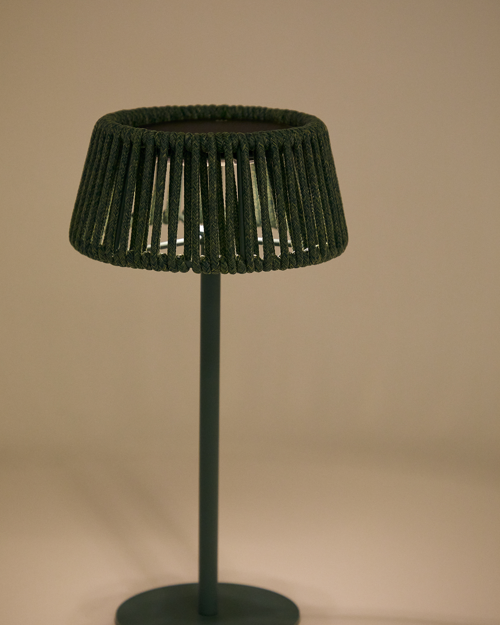 • Hordozható napelemes asztali lámpa türkiz kötélkábellel.