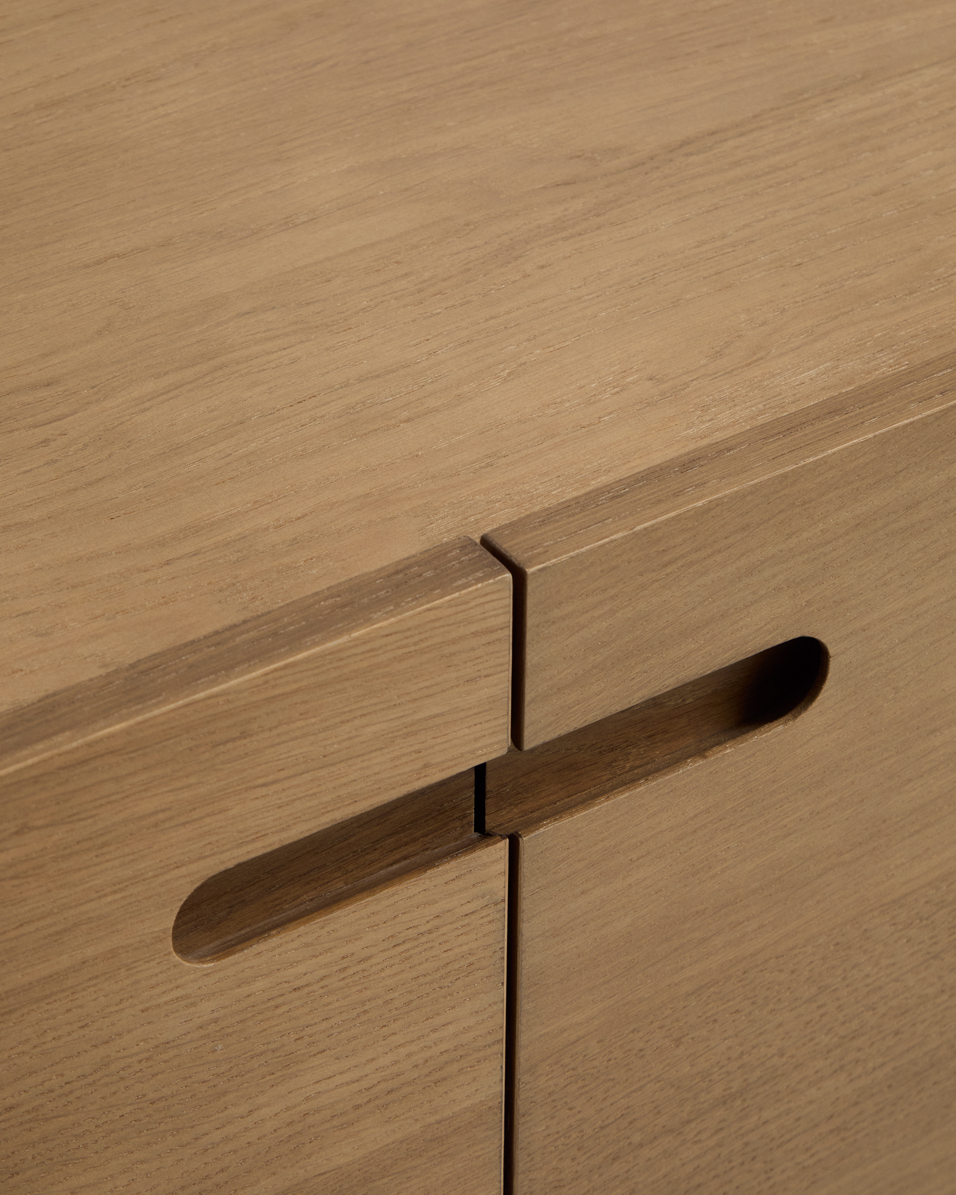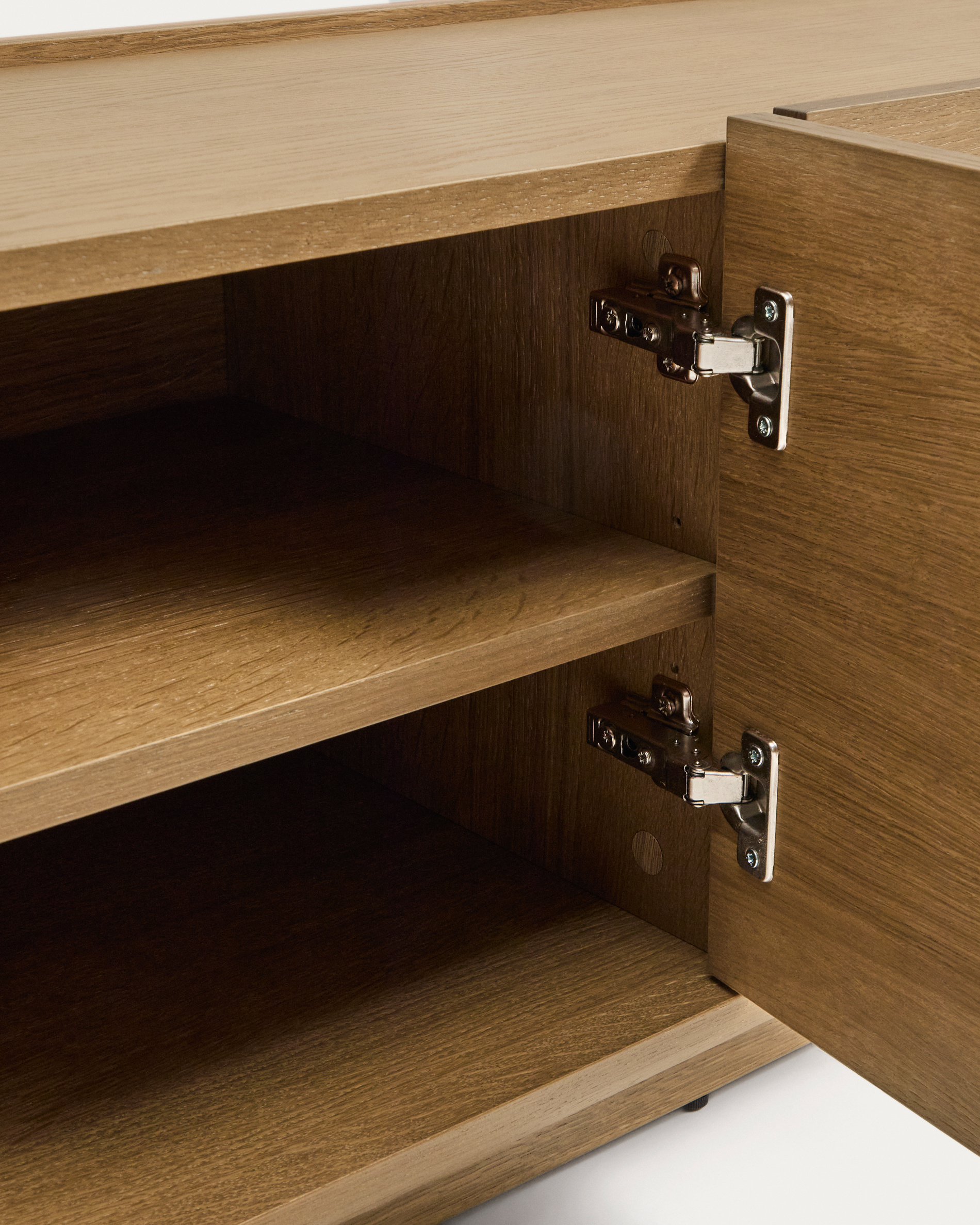 • Tölgyfa furnérból és tömör tölgyfából készült TV-szekrény, világos barna felülettel.