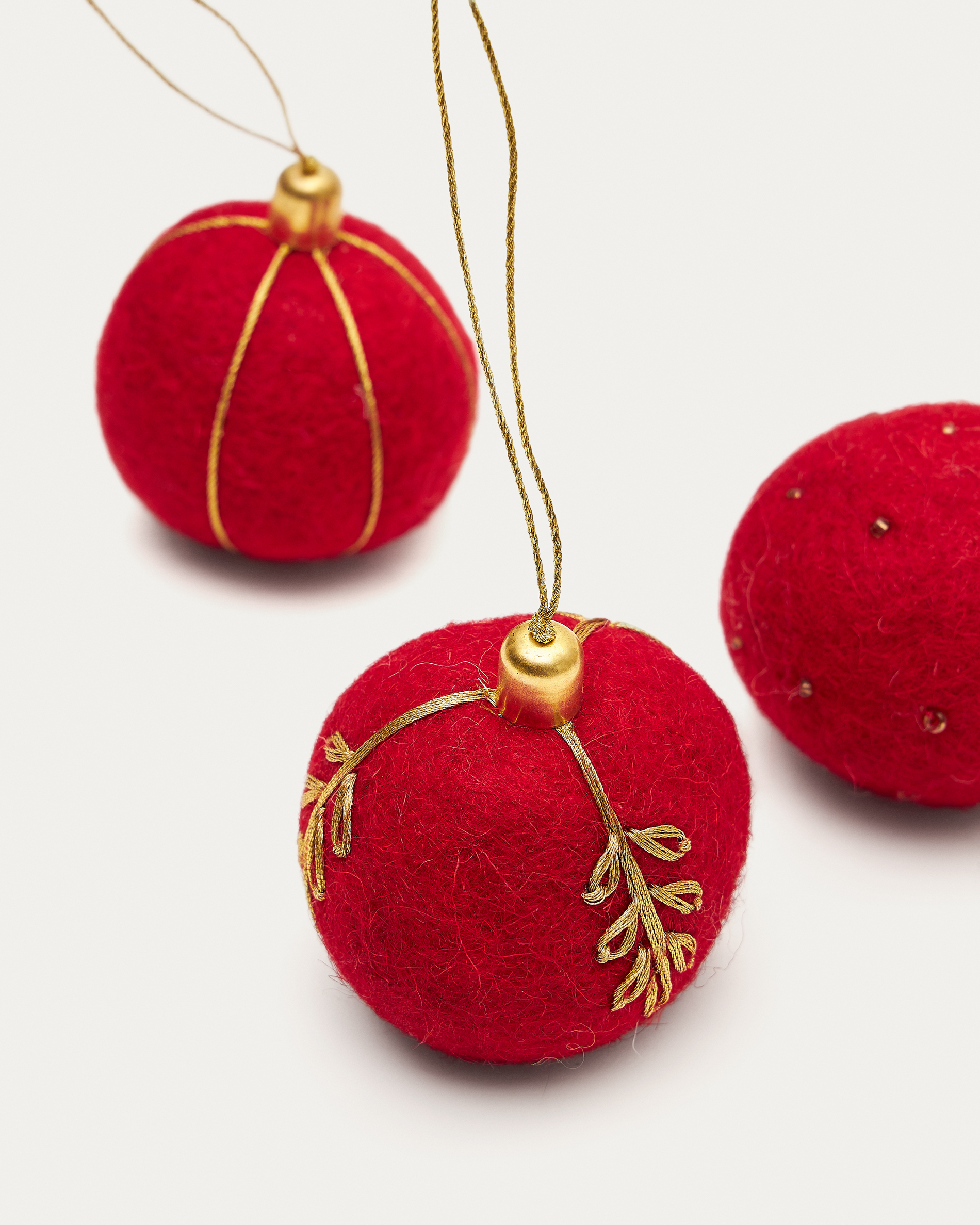 • 3 db piros díszítő akasztó gömb arany motívummal.
