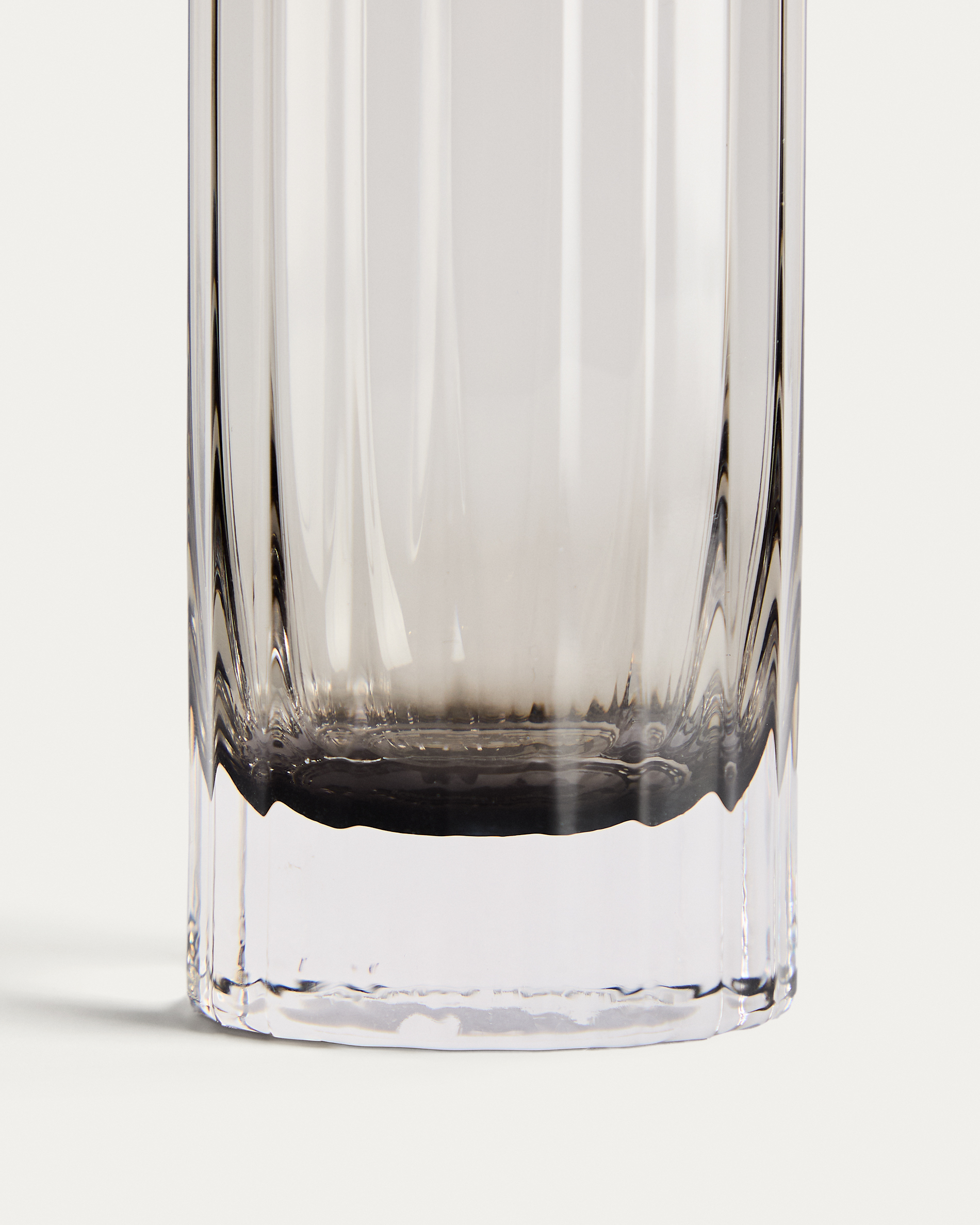 The Clarien collection features grey glass pieces defined by straight lines and geometric silhouettes. The translucent finish softens the shape and tempers the light, adding depth to the designs. Made in dishwasher-safe glass, these pieces are designed for continuous use and are both comfortable and durable. Their restrained character makes them suitable for everyday use or more formal occasions, always maintaining a discreet presence on the table.