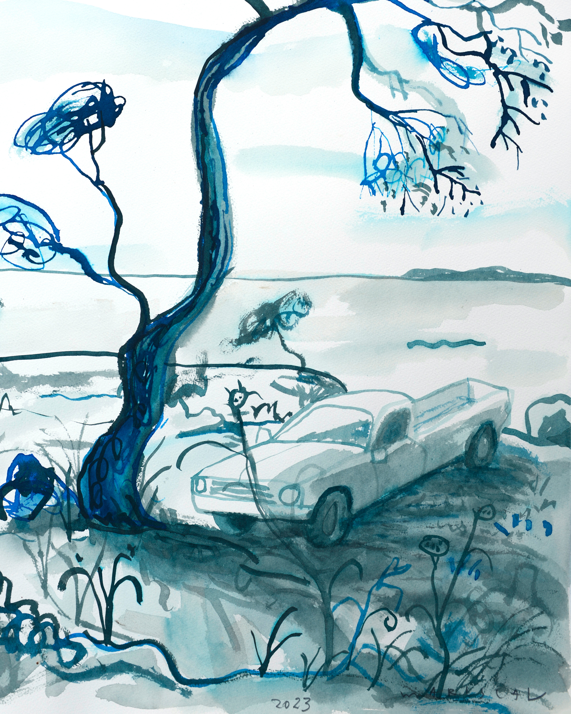 Ez a mű a kékek érzelmi intenzitását és a fény múló természetét vizsgálja a szürkület előtti pillanatban. A szél által formált és egyedül álló fenyő a Földközi-tenger partján a kitartás szimbóluma az idő és az elemek ellen.