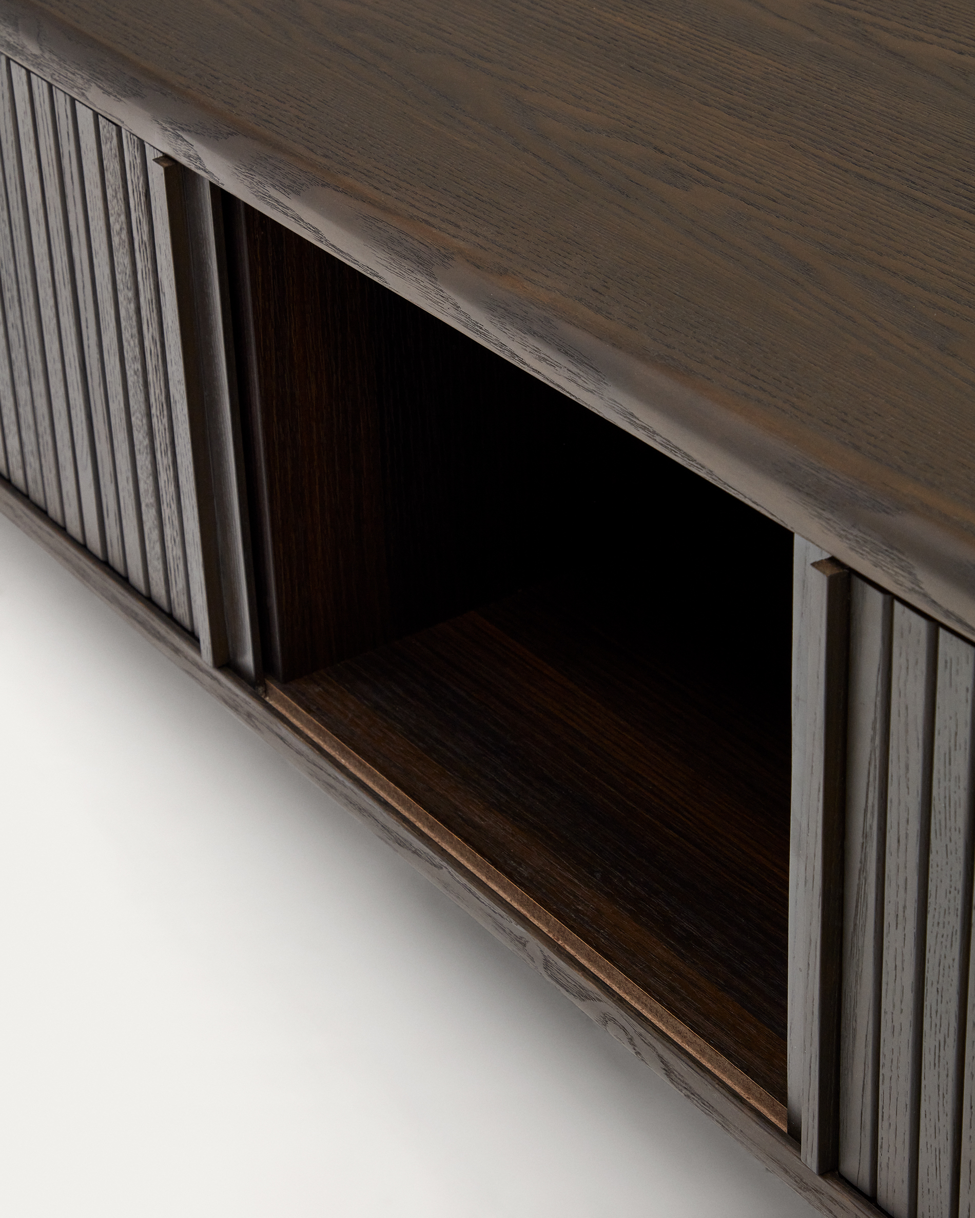 • 2 csúszó ajtó fa lamellákból, hogy elrejtse vagy megmutassa a szekrény belsejét.