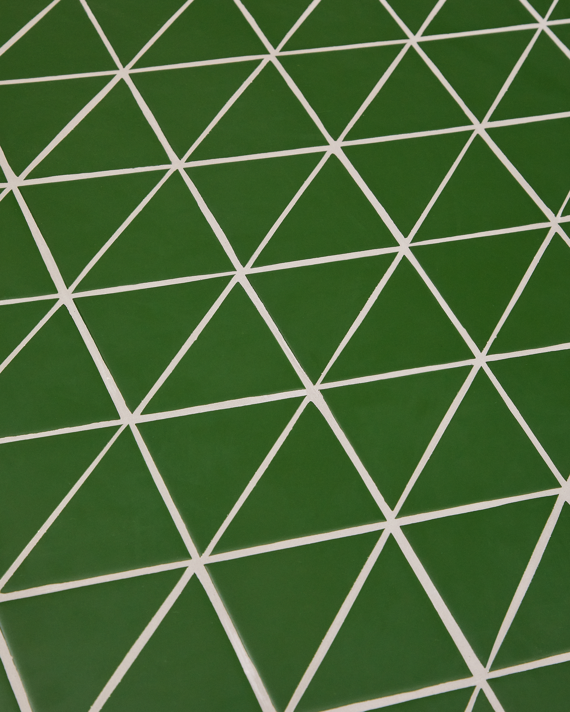 • Kézzel készített geometrikus mozaikból álló zöld csempés topasztal.