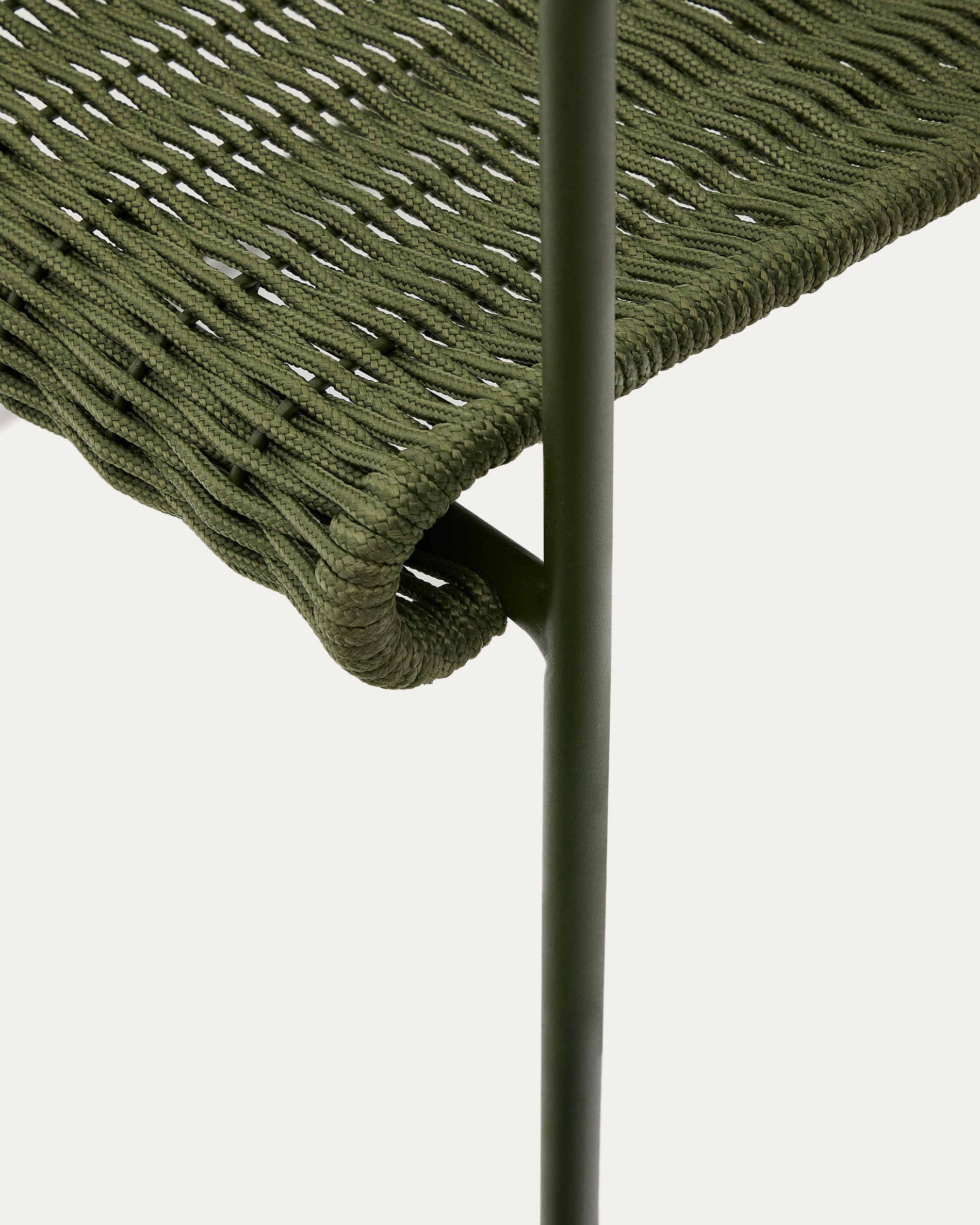 • Kézi fonott, UV-álló zöld kötélből készült ülő- és háttámla, kihajtható, helytakarékos kialakítással.