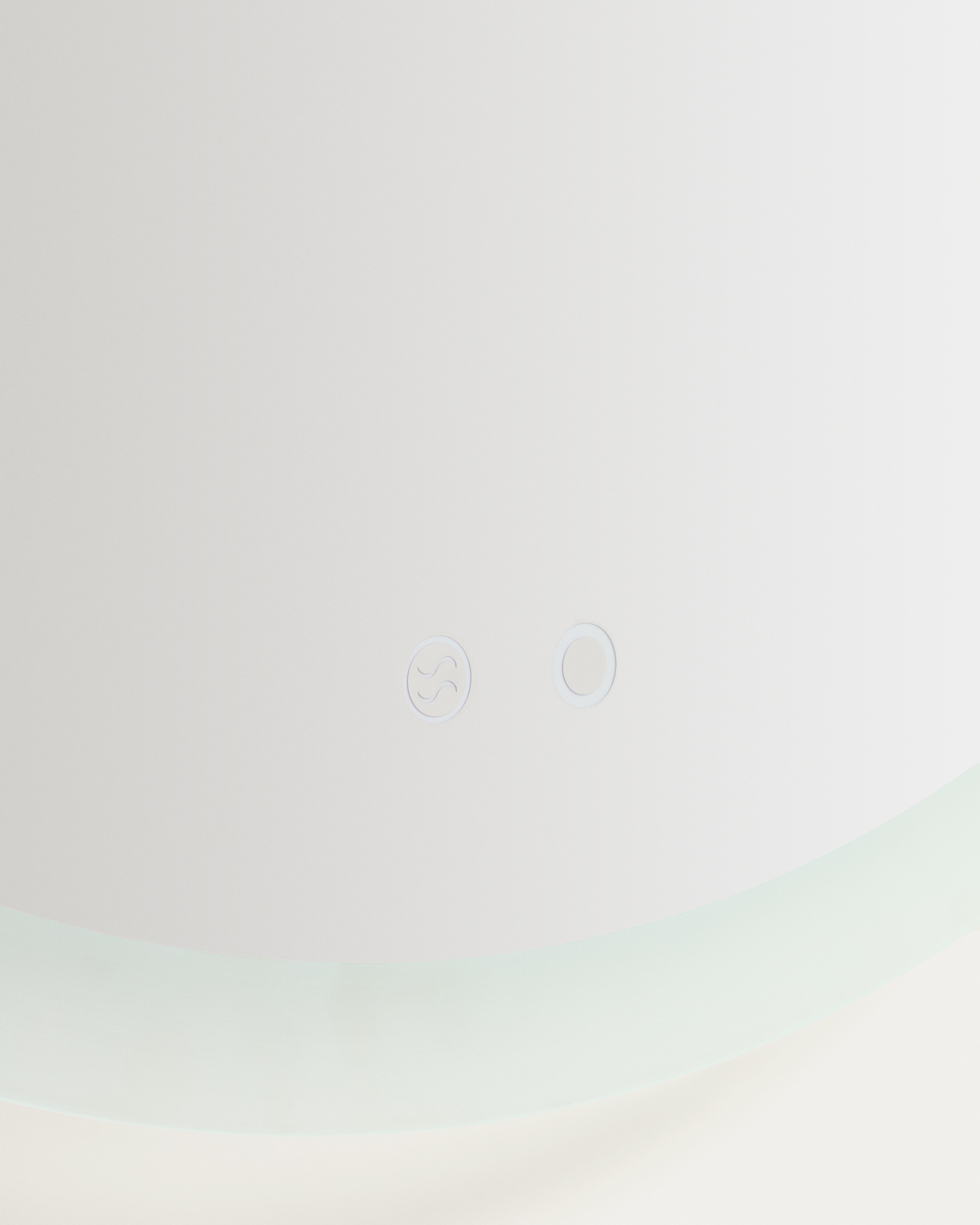 • Kerek fürdőszobai tükör homokfúvott üveg peremmel és páramentesítő funkcióval.