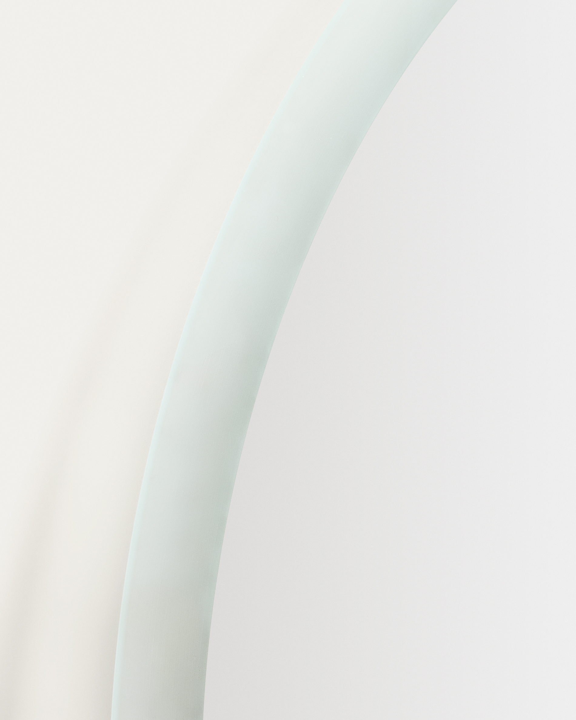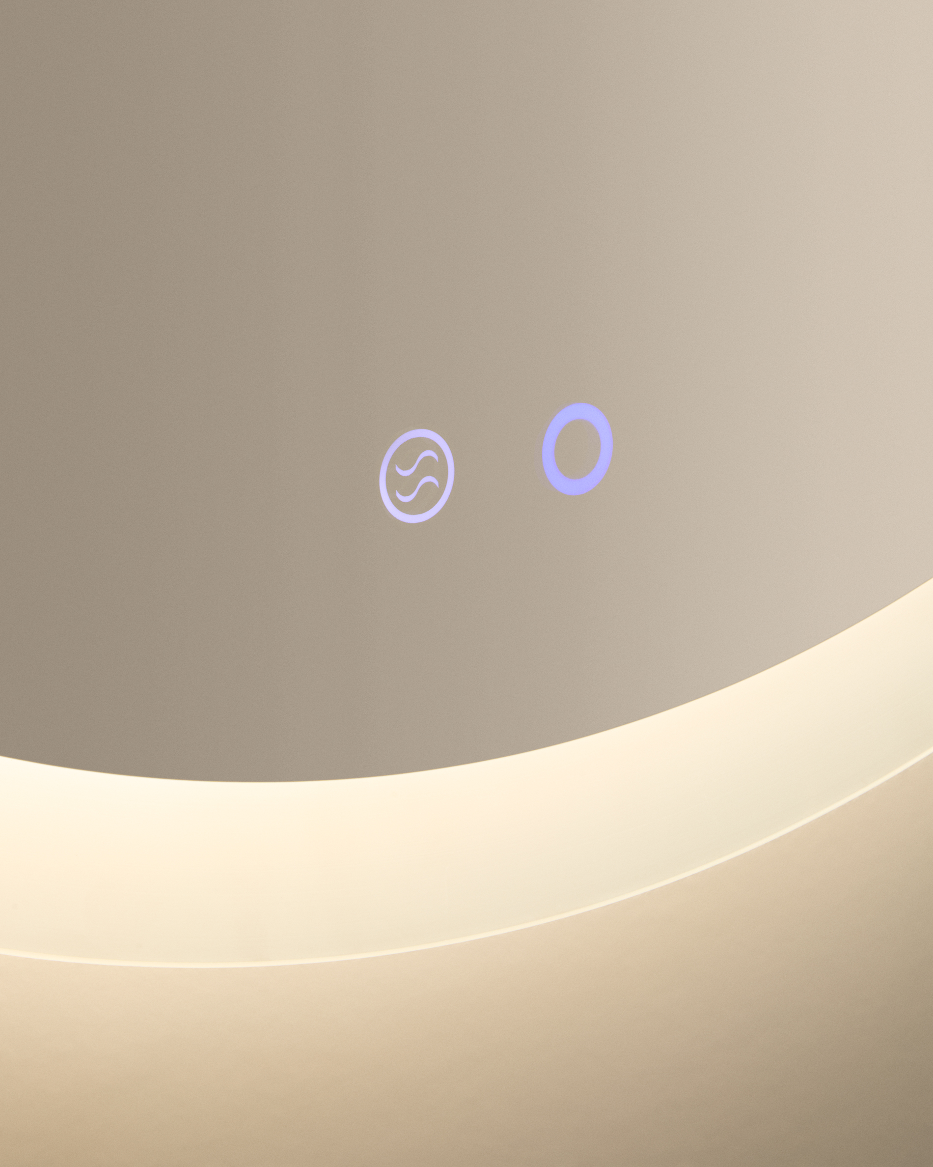 • Kerek fürdőszobai tükör homokfúvott üveg peremmel és páramentesítő funkcióval.