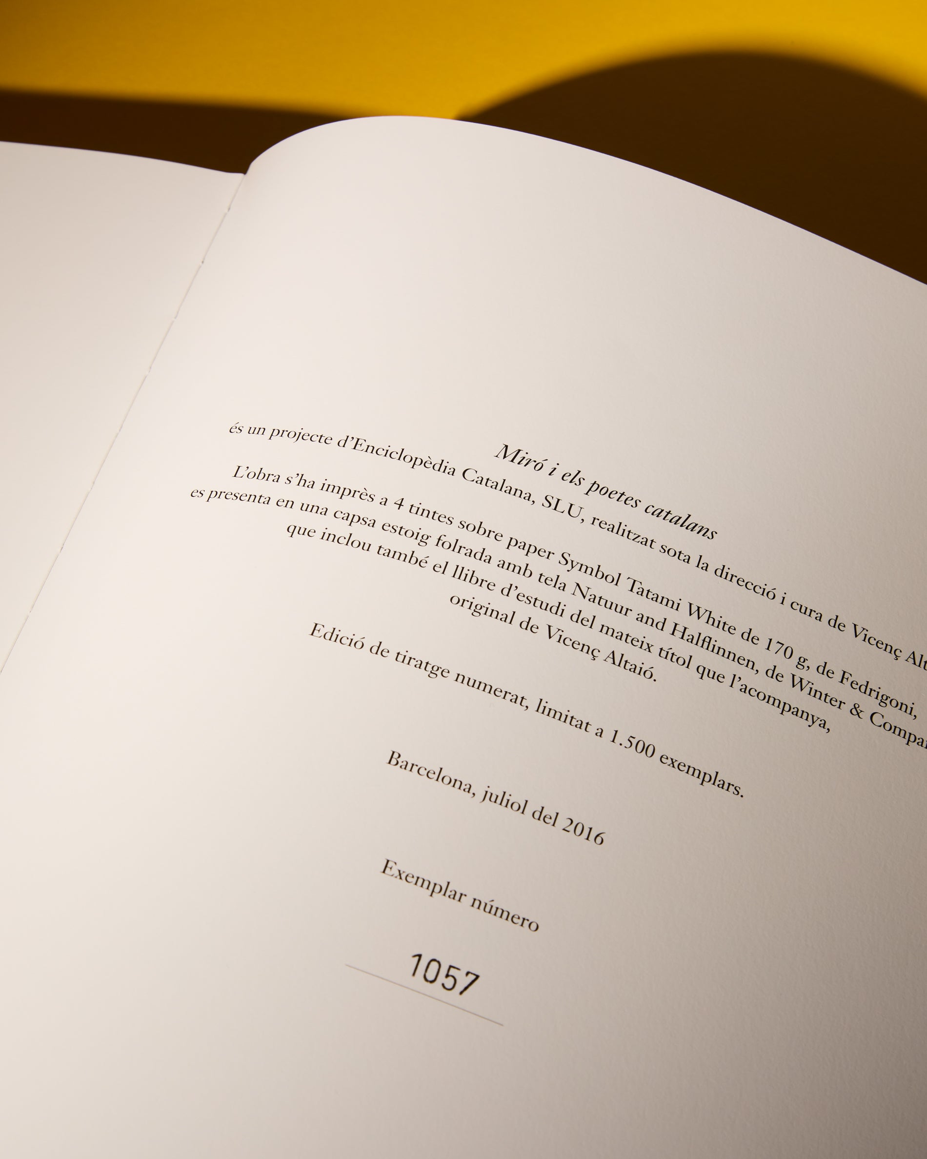 Ez a kétkötetes, sorszámozott kiadás a Enciclopèdia Art sorozat része, amely a 20. század nagy katalán művészeinek, például Dalí, Brossa és Tàpies művészetének szentelt. Ezúttal Joan Miró a főszereplő, az egyik legmindenki által ismert és elismert művész. Nagy költői olvasóként Miró többször dolgozott az ország, kultúra és nyelv költőivel: J.V. Foix, Salvador Espriu, Joan Brossa, Salvat-Papasseit... Miró és a katalán költők első alkalommal gyűjti össze ezeket a kiadványokat, melyek közül sok olyan rövid példányszámban jelent meg, hogy szinte észrevétlenek maradtak. Vezető kutatója, Vicenç Altaió irányításával, a projektben részt vettek a művész örökösei, valamint a Joan Miró Alapítvány Barcelonában és a Pilar és Joan Miró Alapítvány Palma de Mallorca-ban, így egyedülálló lehetőséget kínálva a festészet és a költészet kapcsolatának felfedezésére a művész munkáiban.