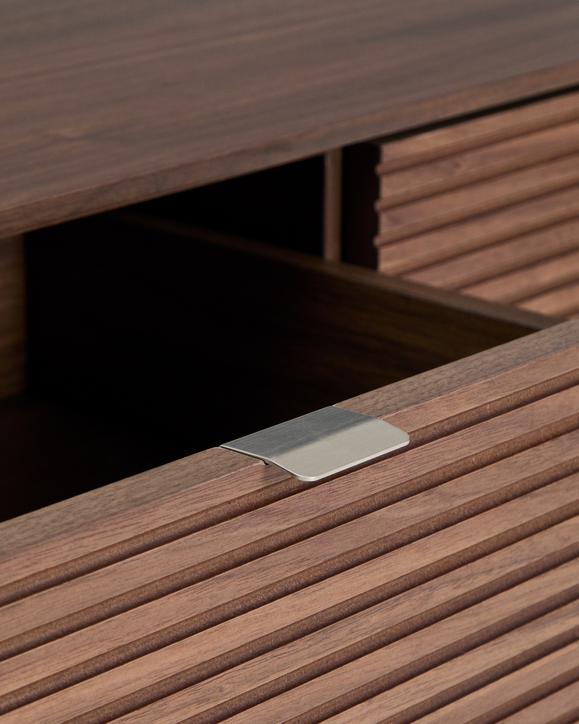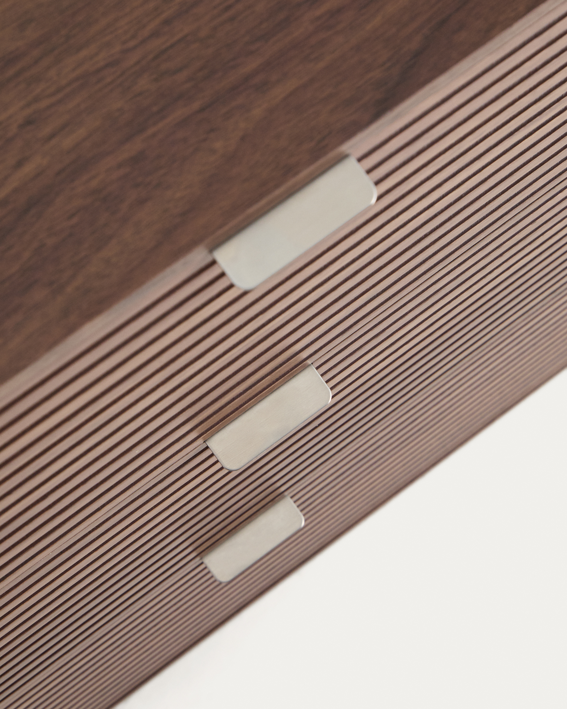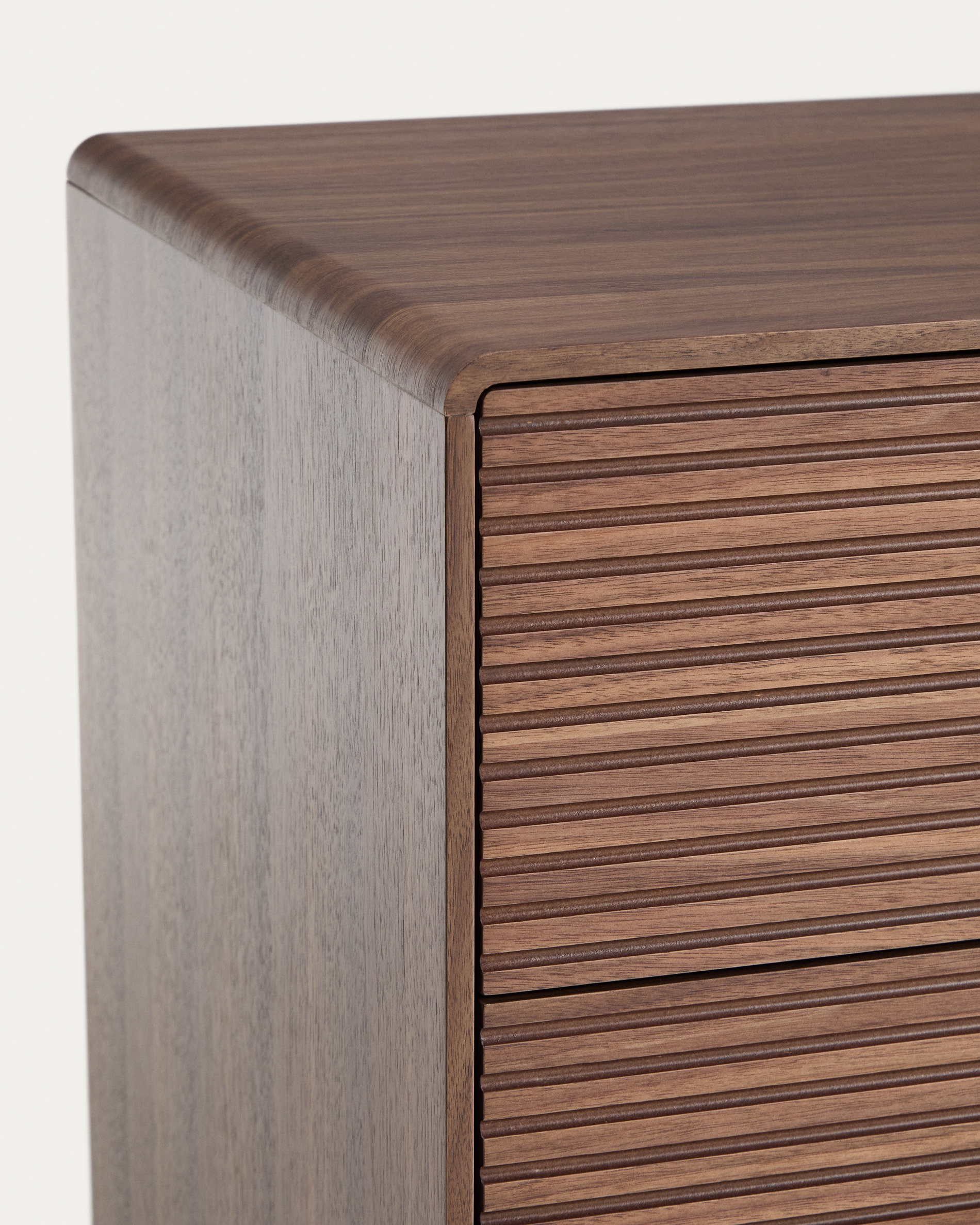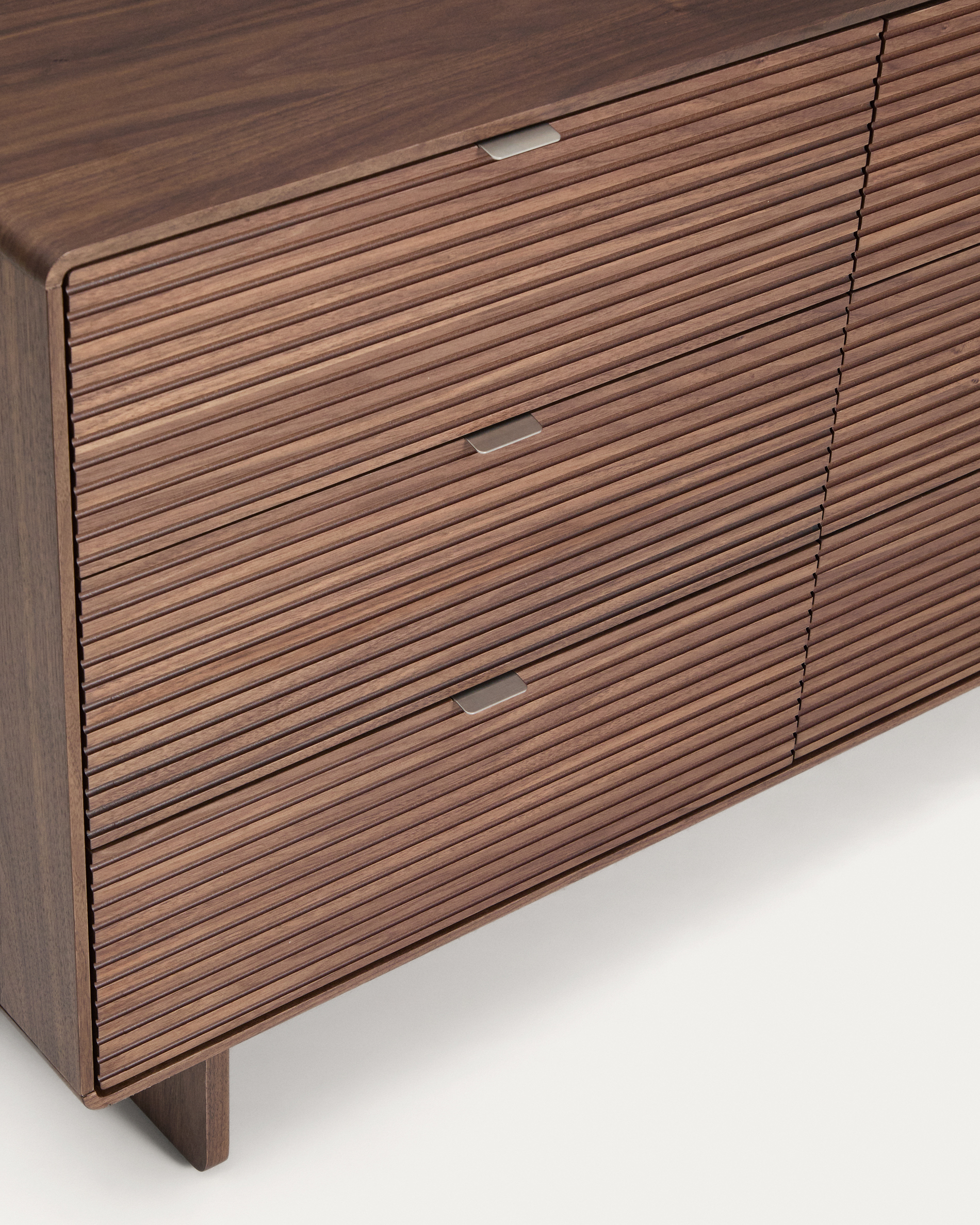 • Diófa furnérból készült komód, 6 fiókkal, rejtett futókkal és soft-close rendszerrel.