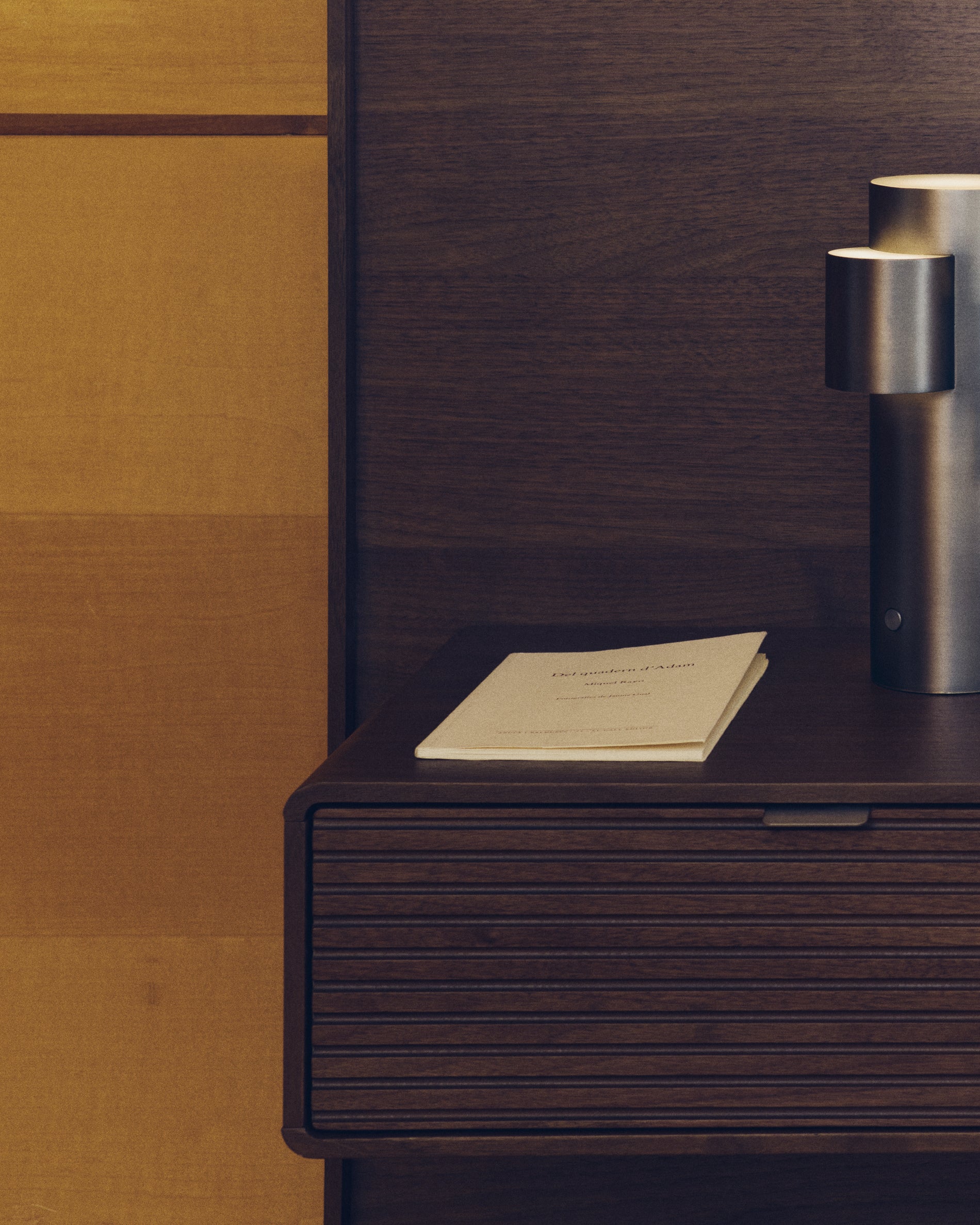• Fejvég dióbarna furnérral és vízszintes lineáris marással, LED világítással a tetején.