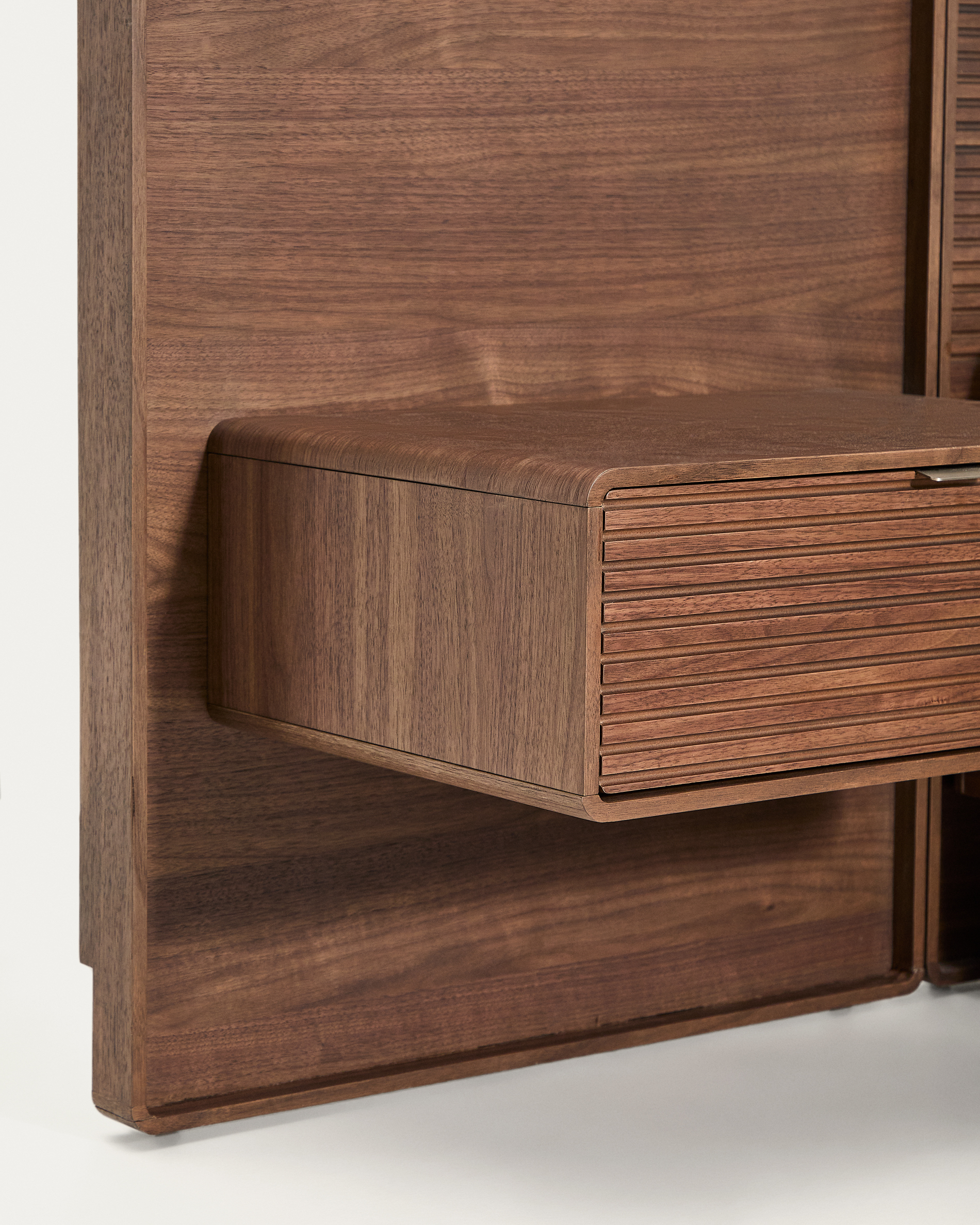 • Fejvég dióbarna furnérral és vízszintes lineáris marással, LED világítással a tetején.