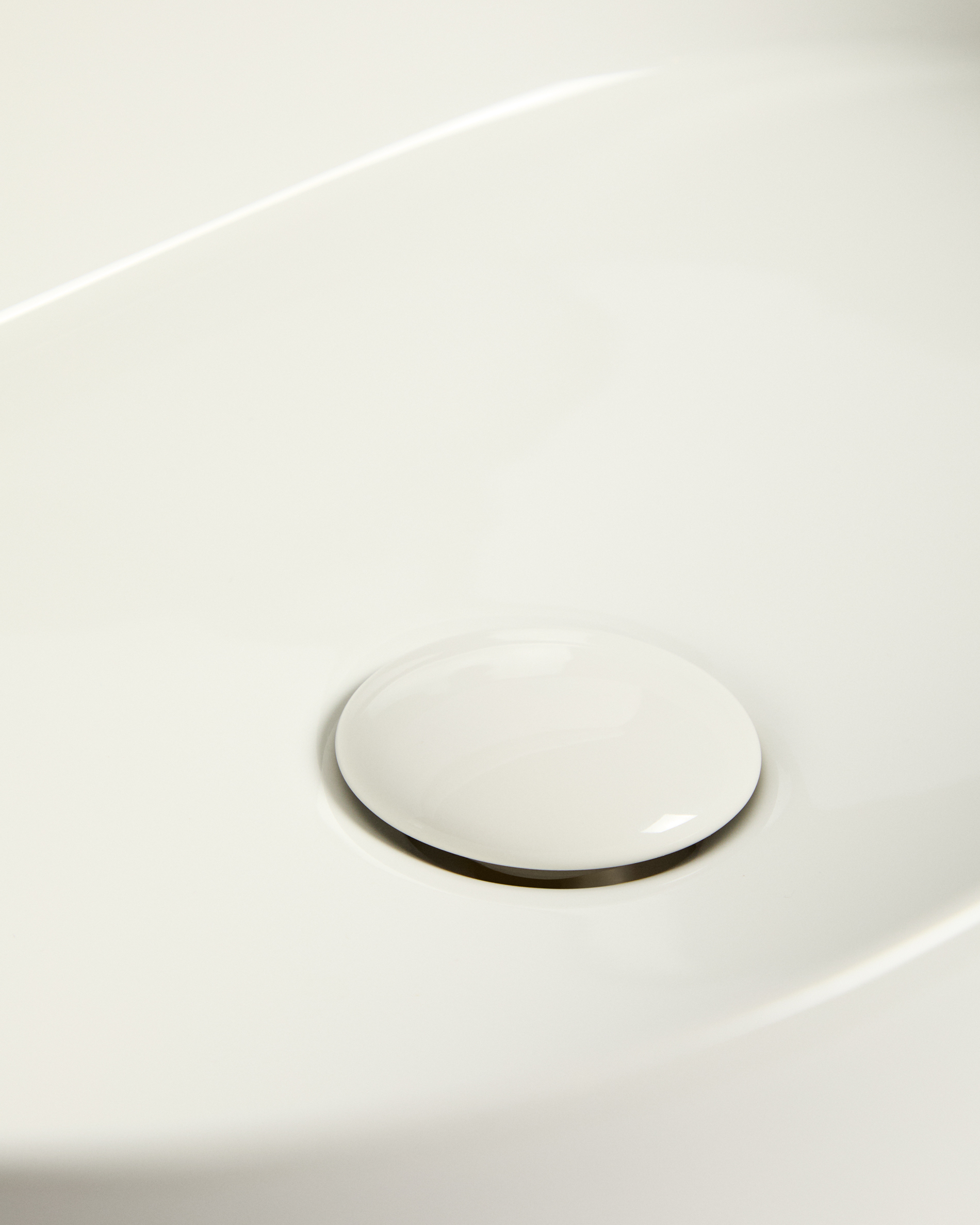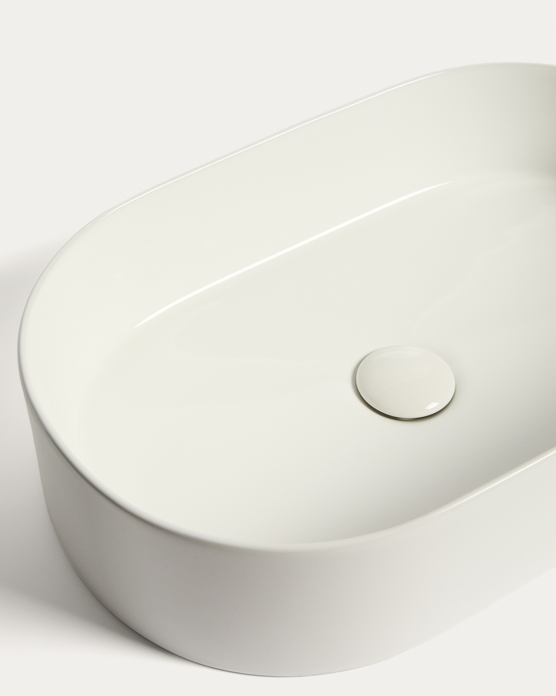 • Fehér mázas kerámiából készült mosdóasztali mosdó.