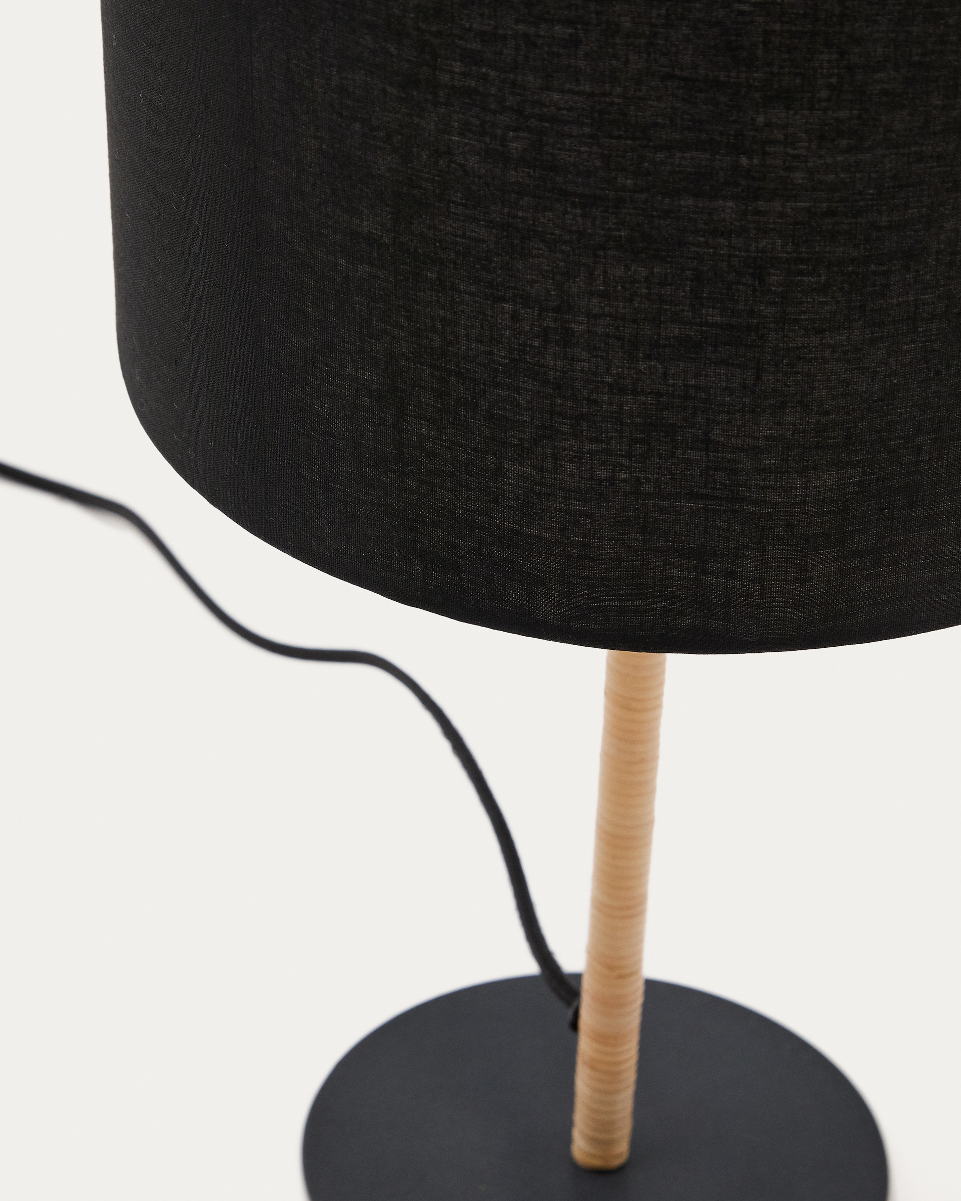 • Fém asztali lámpa természetes rattan részlettel és fekete pamut árnyékkal.