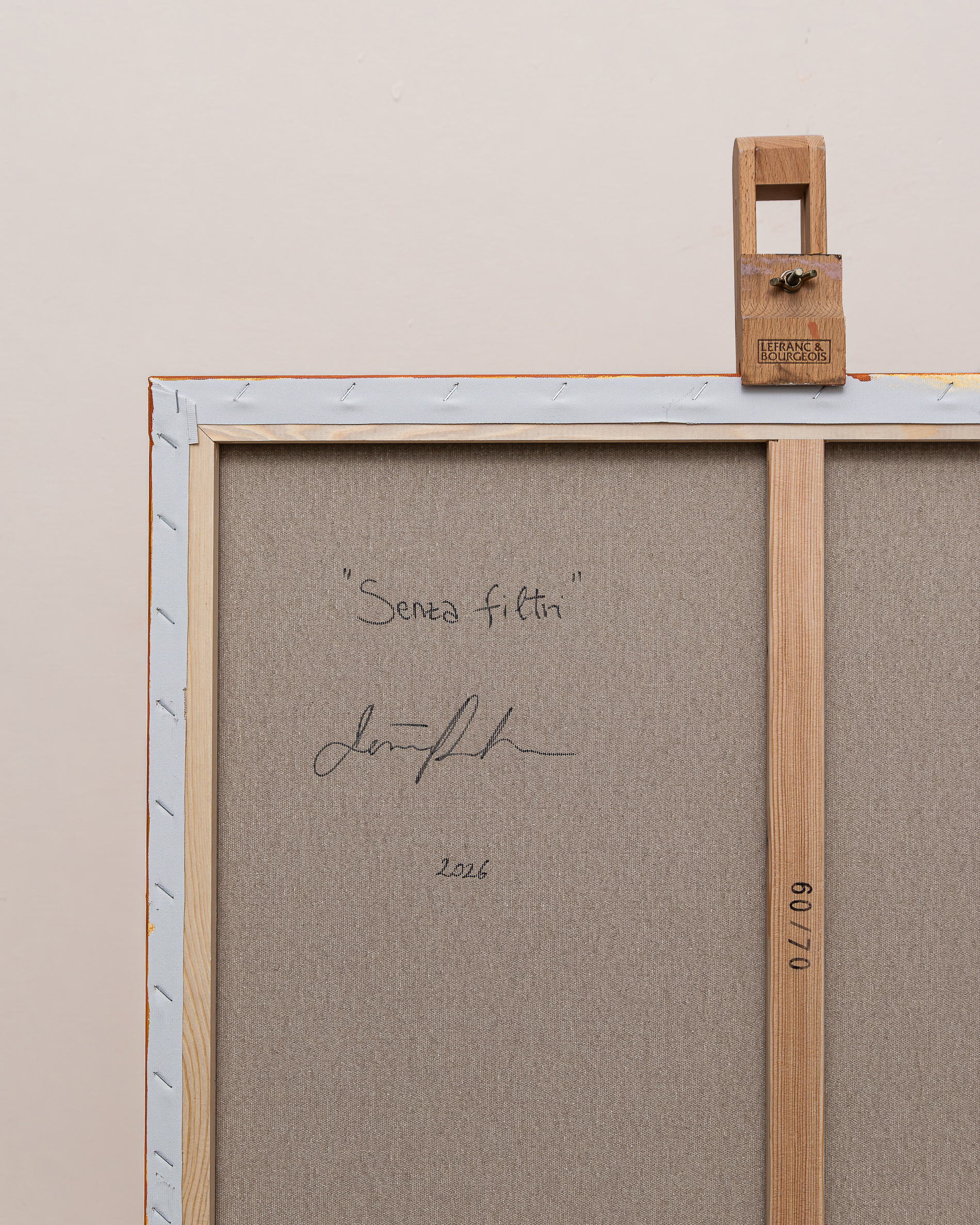 A Senza Filtri egy tükörrel való találkozást kínál, amely nem ítélkezik, hanem tükrözi, ami már ott van. A figura frontálisan és nyugodtan jelenik meg, művészi álarc nélkül: nem próbál magyarázni vagy lenyűgözni, csak a nyugalommal és tisztasággal tölti meg a pillanatot. Nem grandiózus kijelentés, hanem egy létezési mód: önmagunk megmutatása, kiegészítések nélkül. Egyszerűség és jelenlét gyakorlata, amely arra ösztönöz, hogy felismerjük a lényegest.