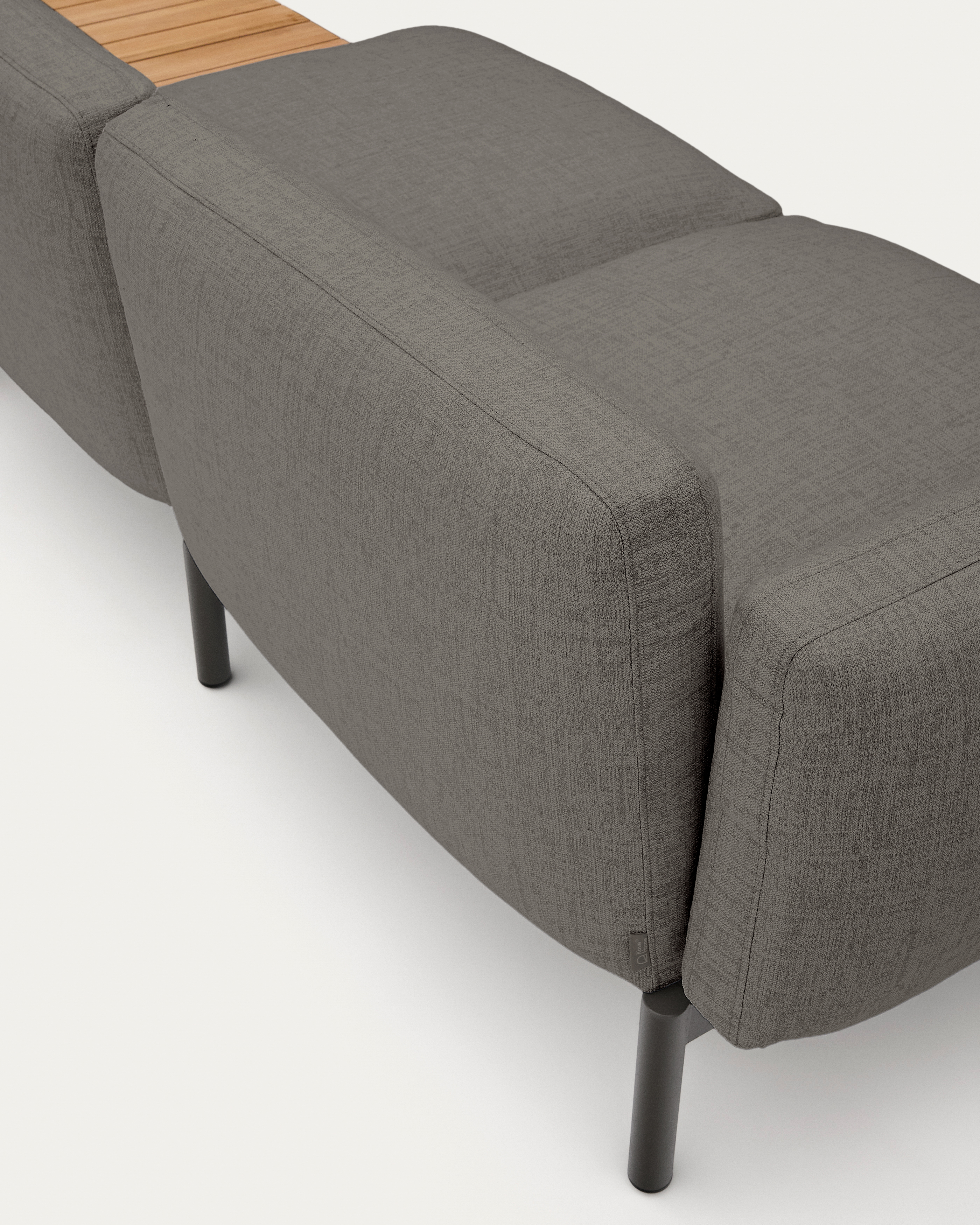 • 3 személyes moduláris kültéri kanapé szürke kárpittal és szürke alumínium szerkezettel. Beépített asztallal és teak végasztallal.