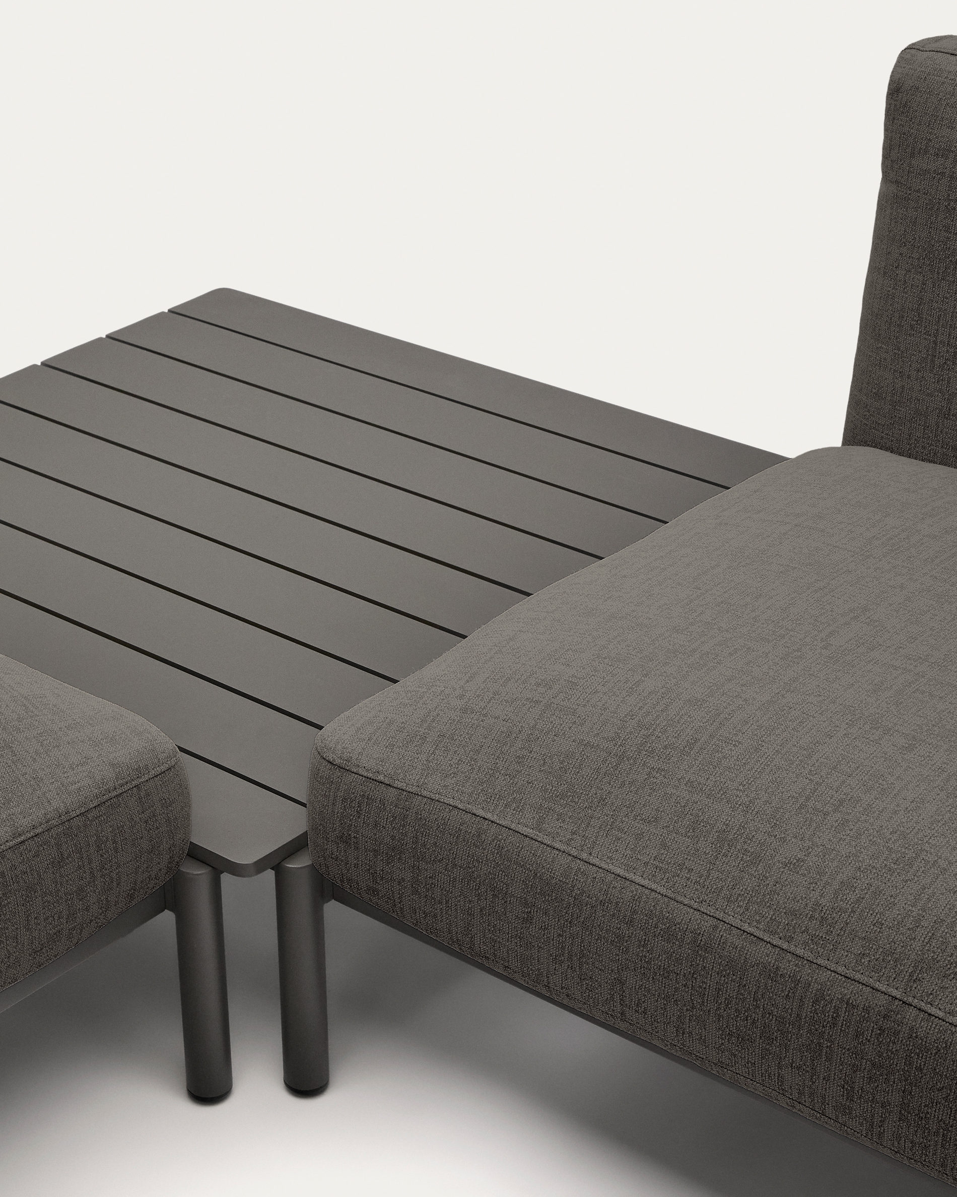 • 4 személyes moduláris kültéri kanapé szürke kárpittal és szürke alumínium szerkezettel. Beépített asztallal és teak végasztallal.