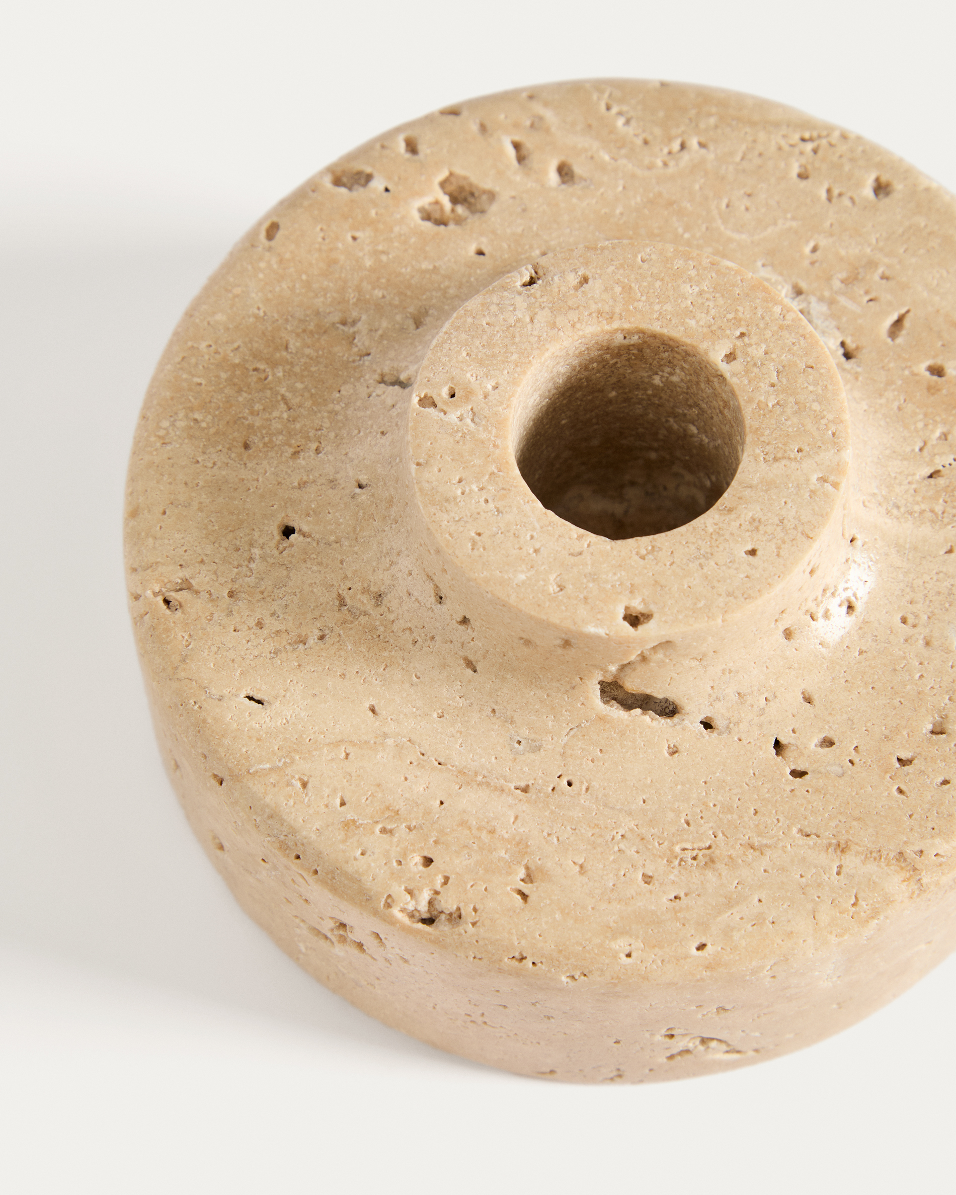 Ez a travertin gyertya tartó jellegzetes textúrájával, finom szabálytalanságaival és meleg árnyalataival tűnik ki. Minden darab saját árnyalatokkal és erezettel rendelkezik, amelyek egyedivé teszik. Súlya és szilárdsága stabil alapot biztosít a gyertyának, miközben tiszta vonalai és kiegyensúlyozott arányai sokoldalú díszítőelemmé teszik, amely könnyen beilleszthető különböző otthoni terekbe.